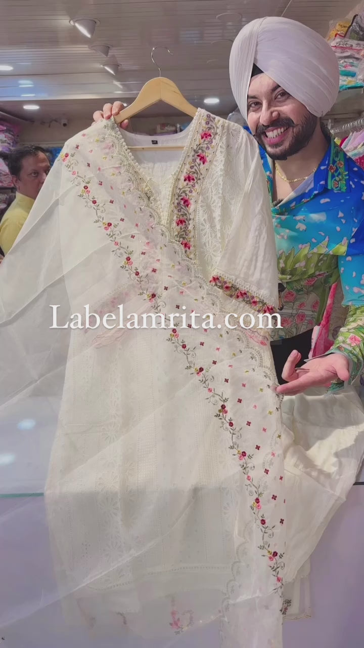 Off white Muslin silk Embroidered Pakistani suit with Beautiful Organza Duppata