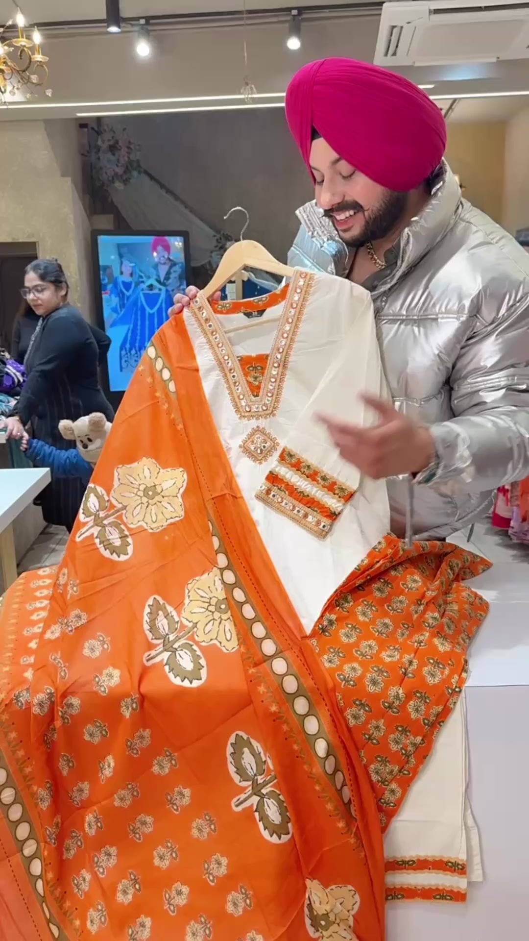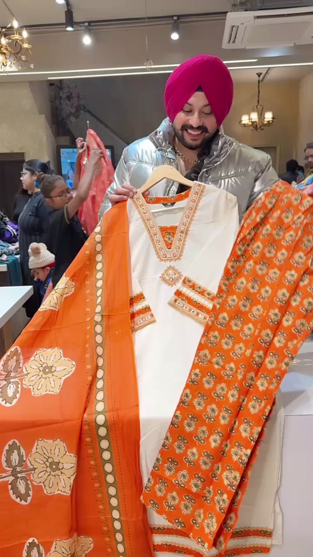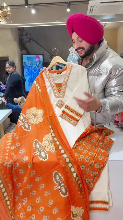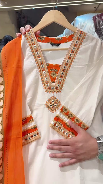 Off White & Orange Semi formal Pure Cotton Suit with Sleek Embroidery Work on Neck