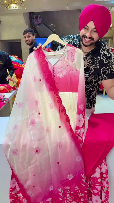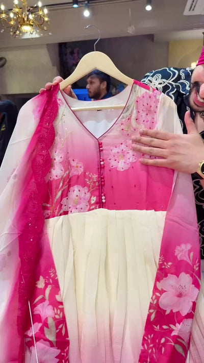 Off white & Pink Chiffon Floral Print Anarkali Suit with Beautiful Hand embroidery Work on Neck
