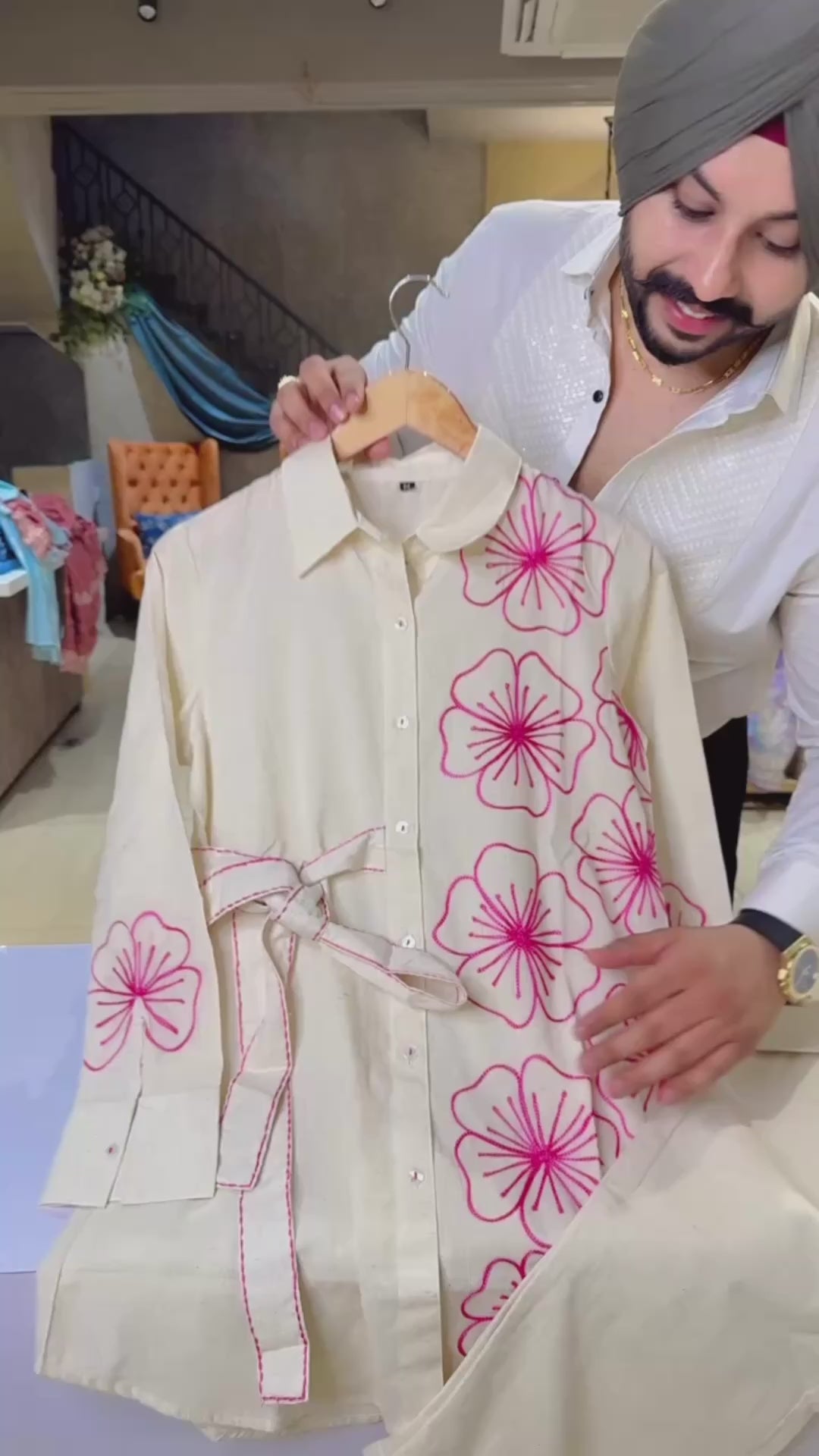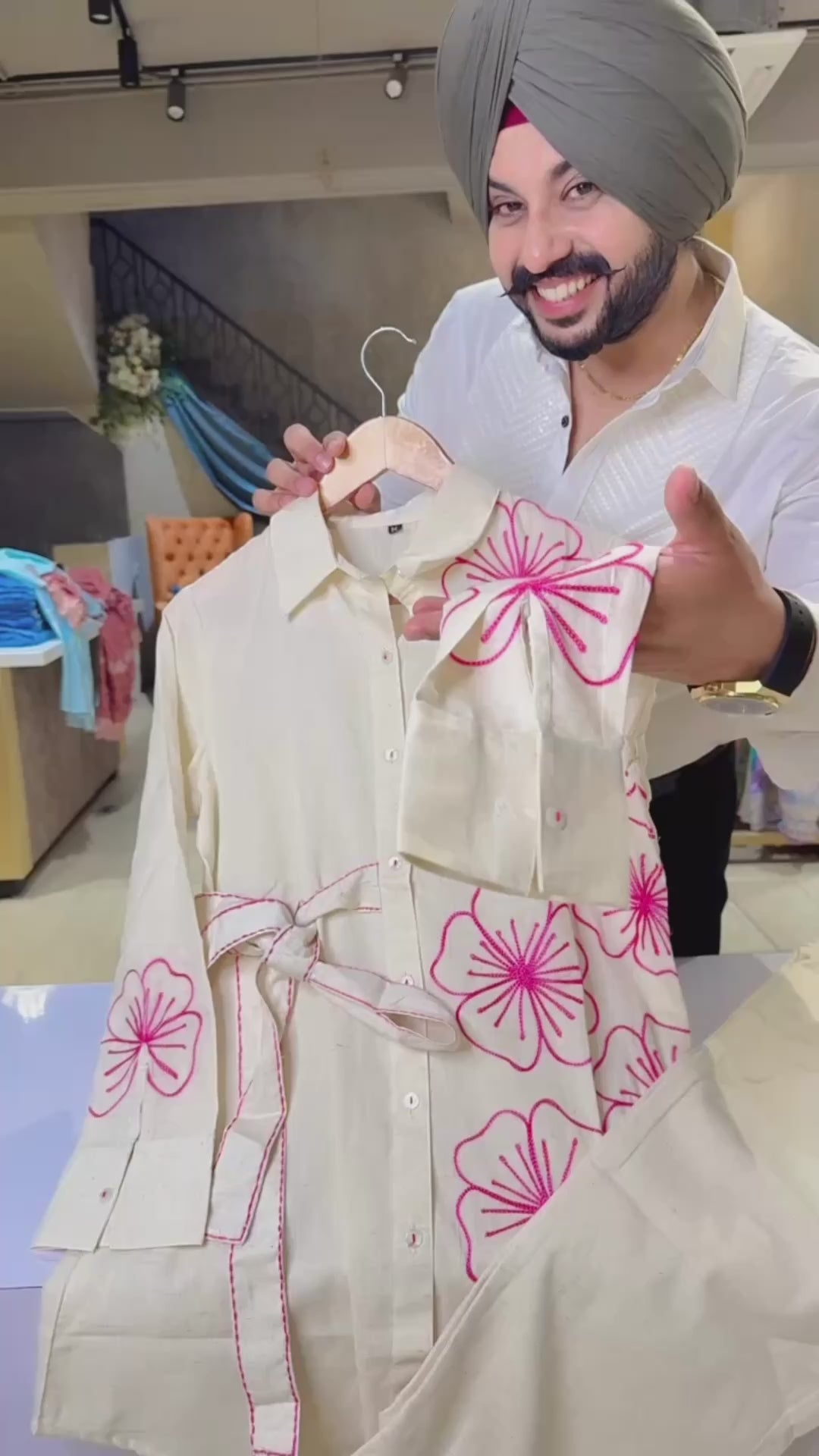 Off white & Pink Girlish Collar Neck Side Knot Embroidered Coord set