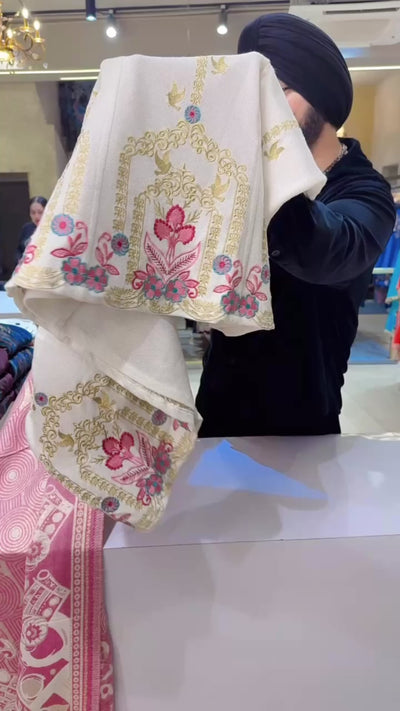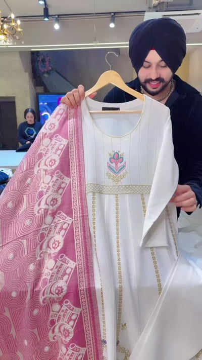 Off White & Pink soft Woolen heavy Embroidered Anarkali Suit with Beautiful Shimmer Woolen Duppata