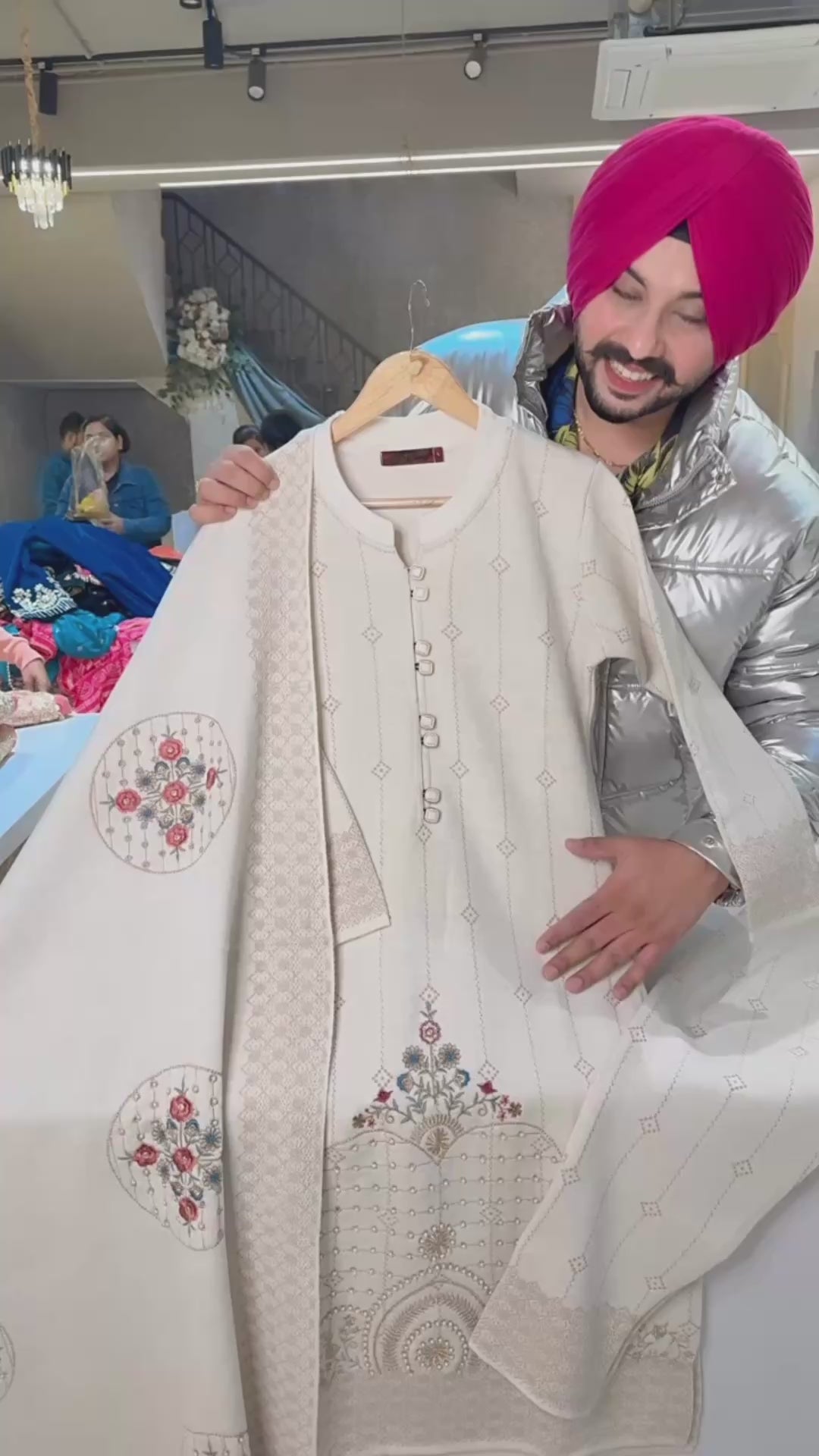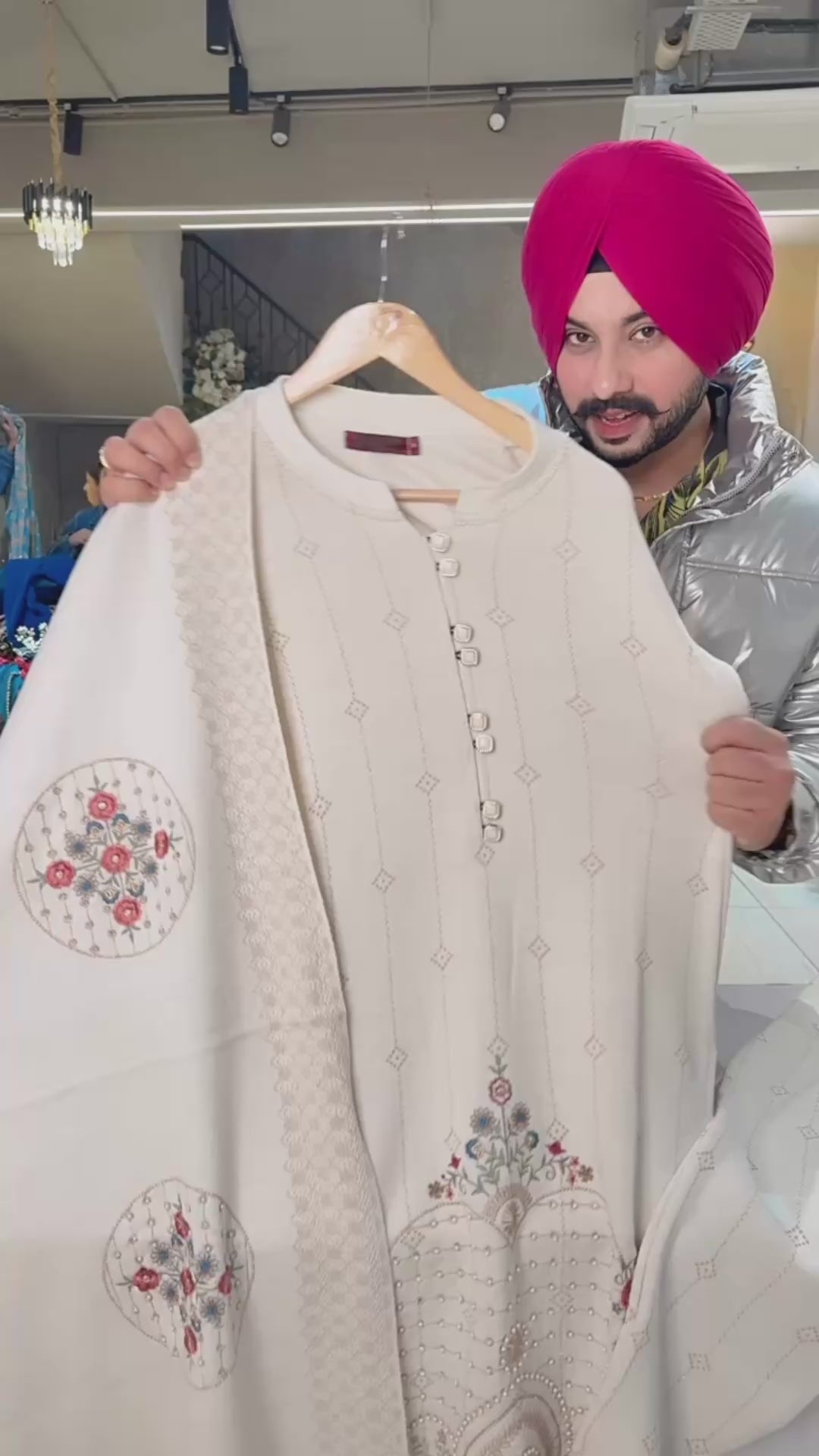 Off white premium Strechable Woolen straight Suit with Heavy embroidered Duppata