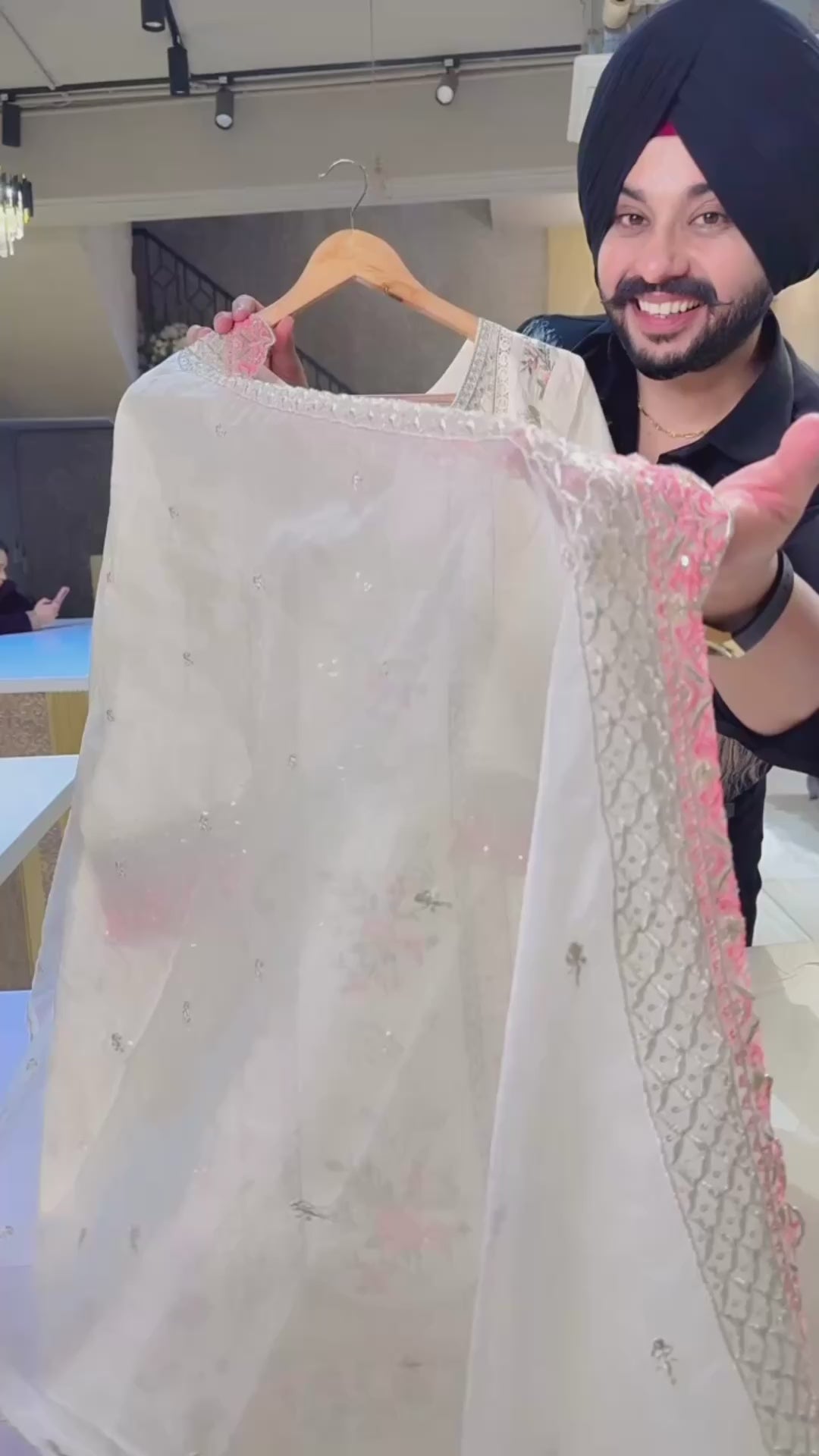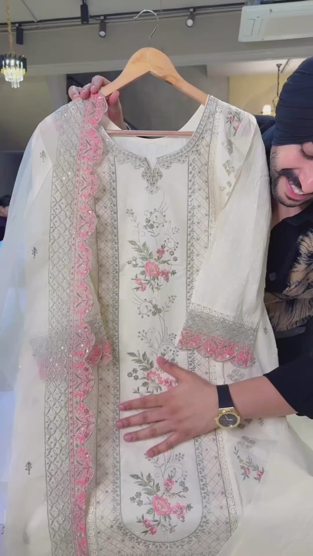 Off White & pink Pure Cotton Heavy embroidered Pakistani Straight Suit with Beautiful organza Duppata