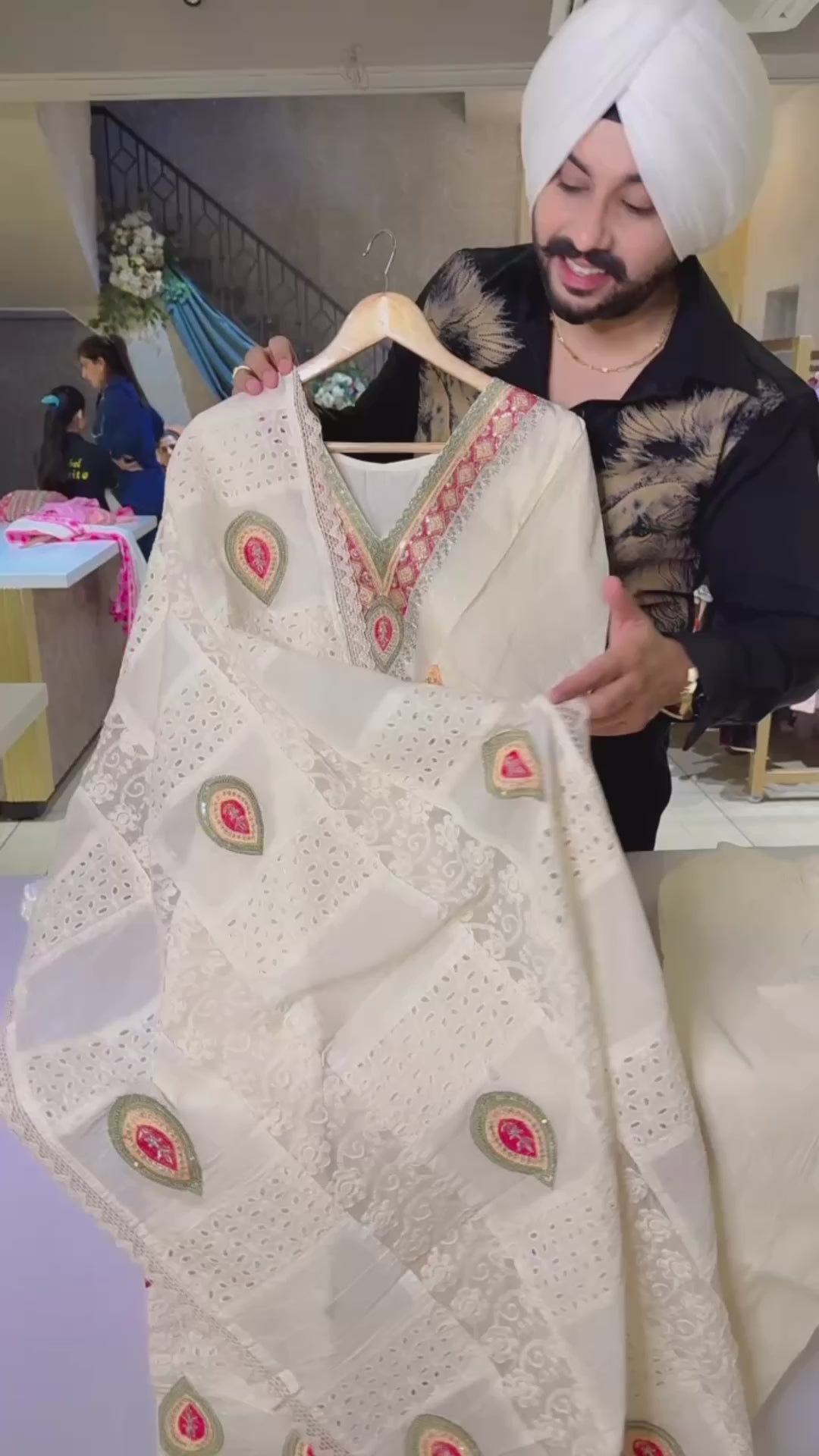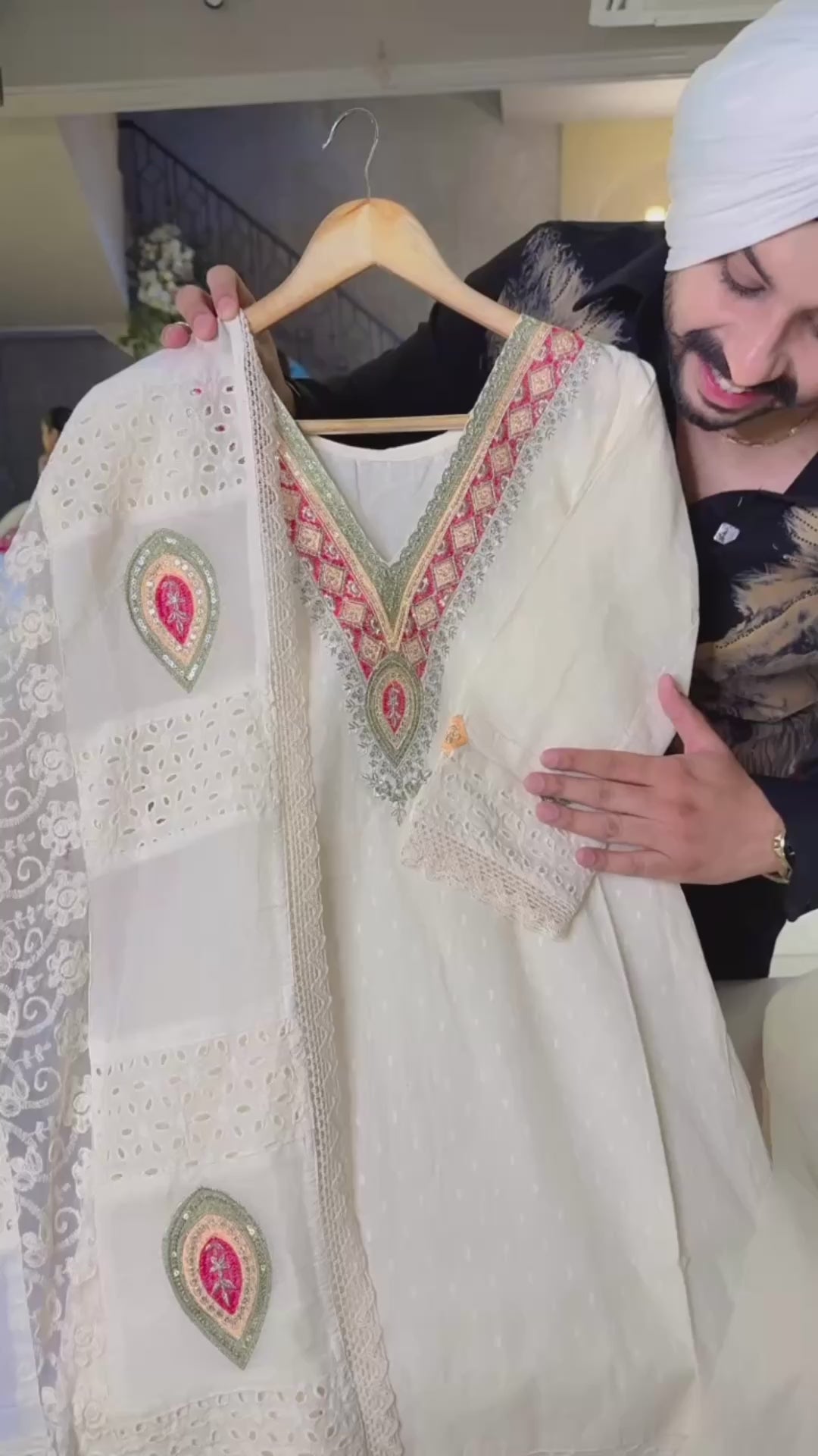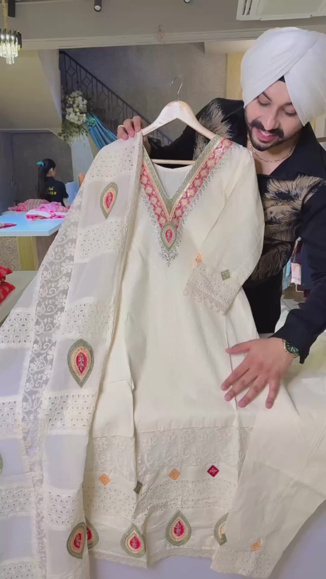 Off white Pure Kora Cotton V-neck Embroidered Pakistani Suit with Embroidered & Shifli Work Heavy Duppata