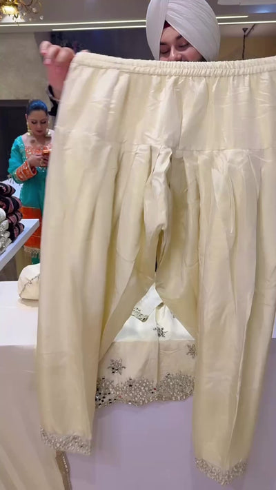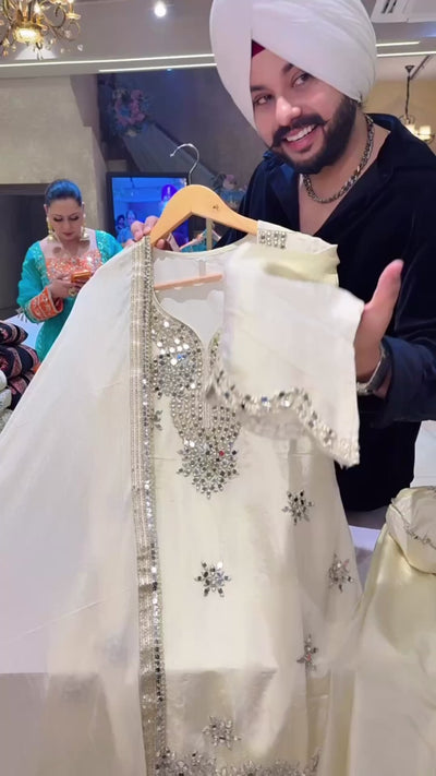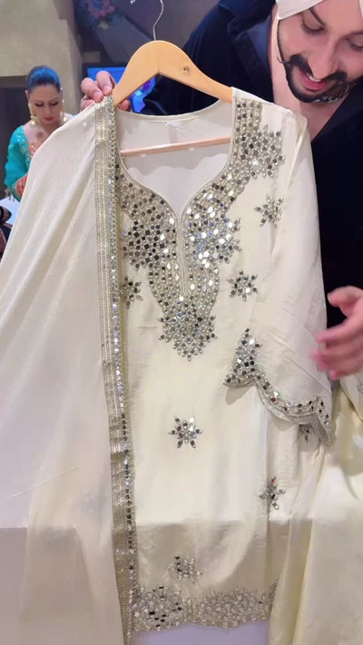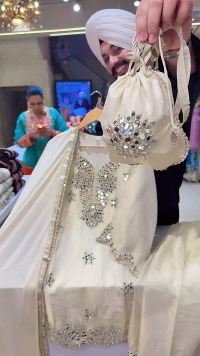 Off White Shimmer Silk Heavy mirror work PartyWear Salwar Suit with Cute Potli