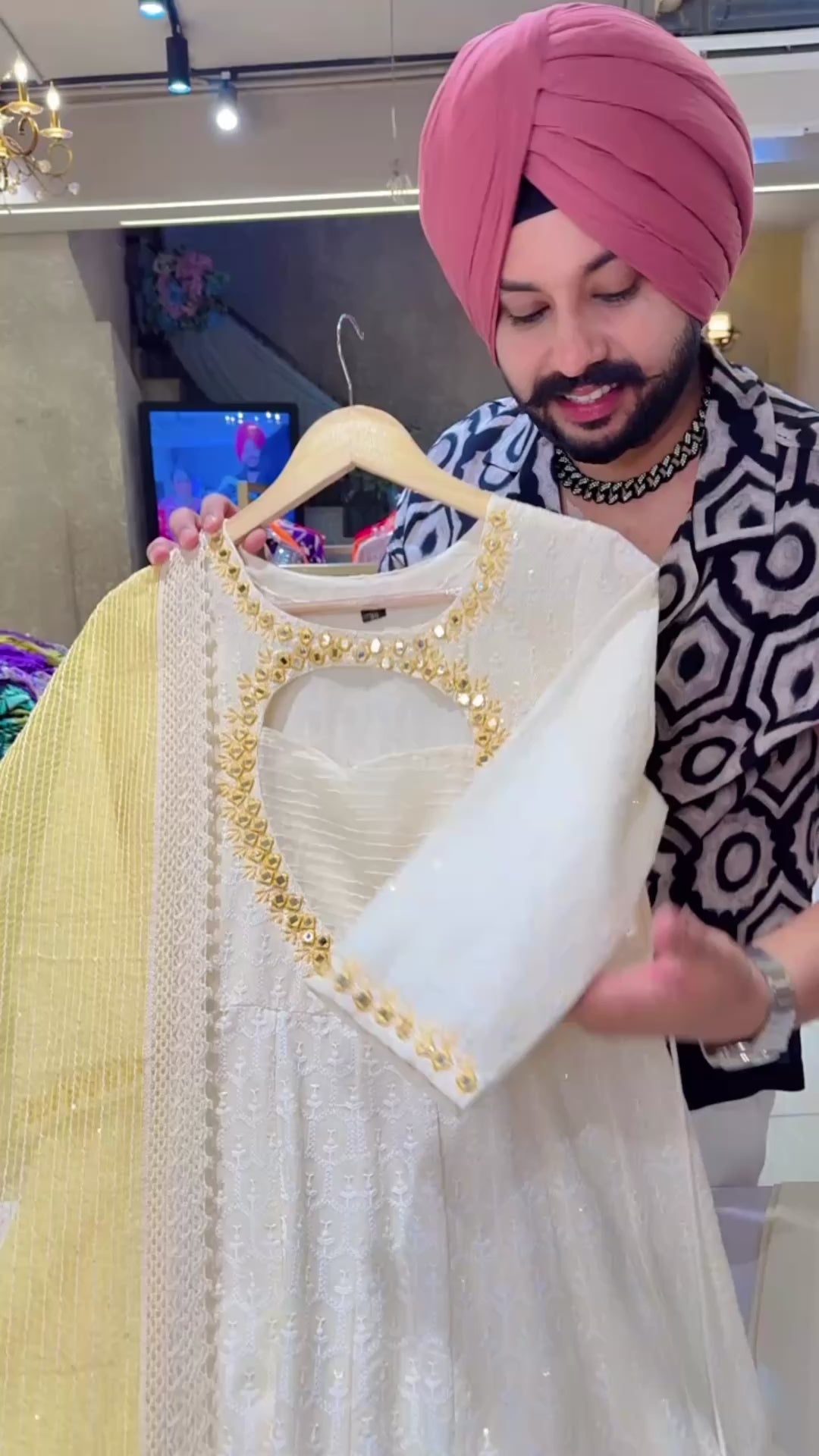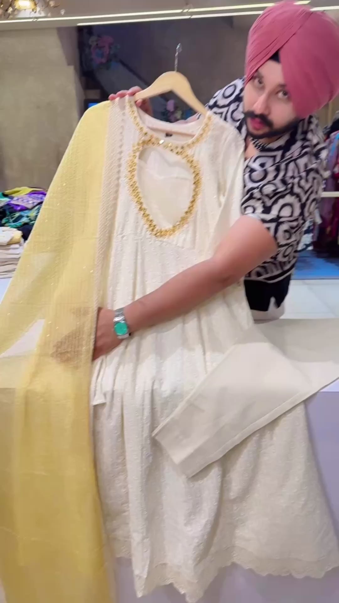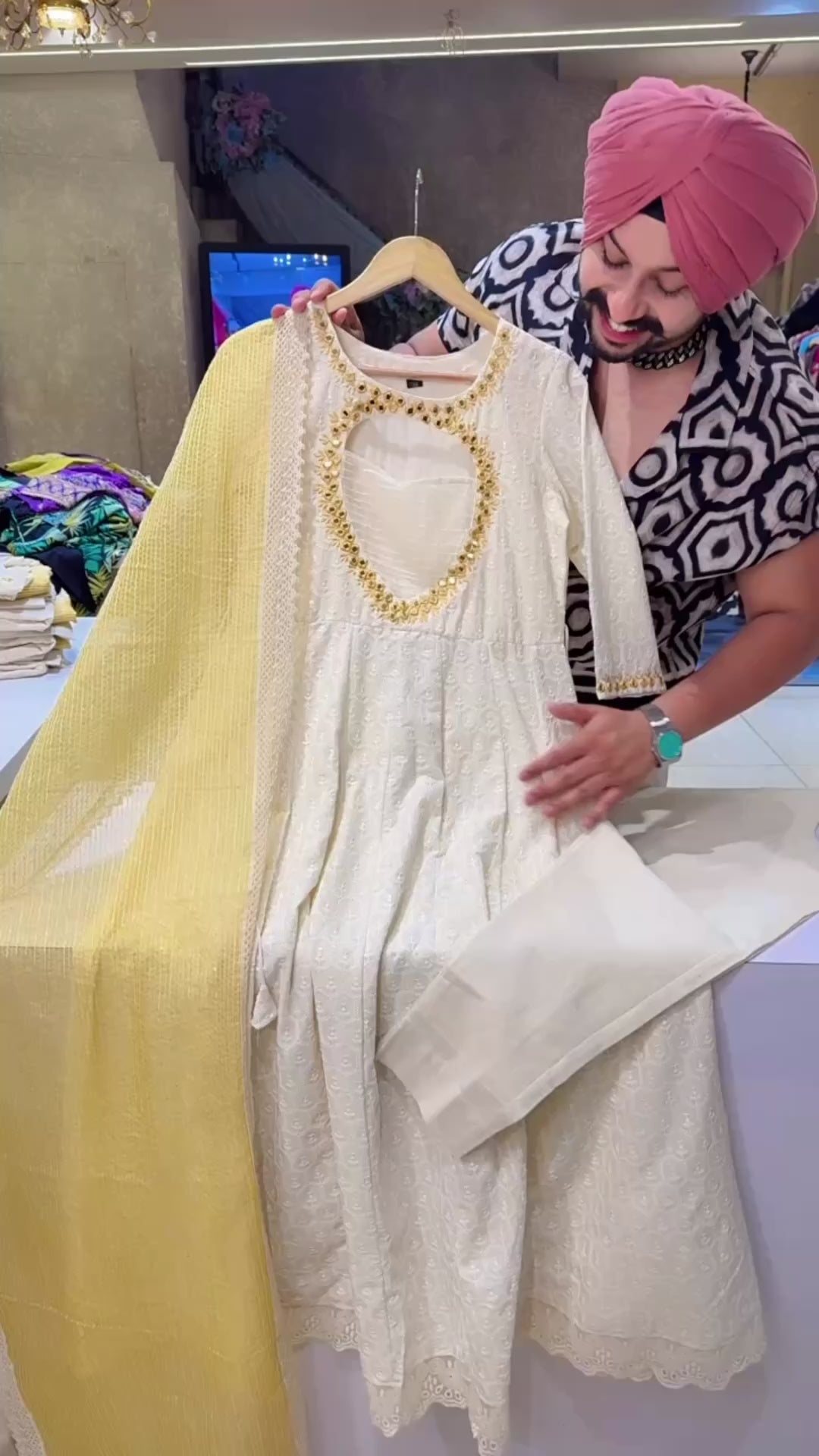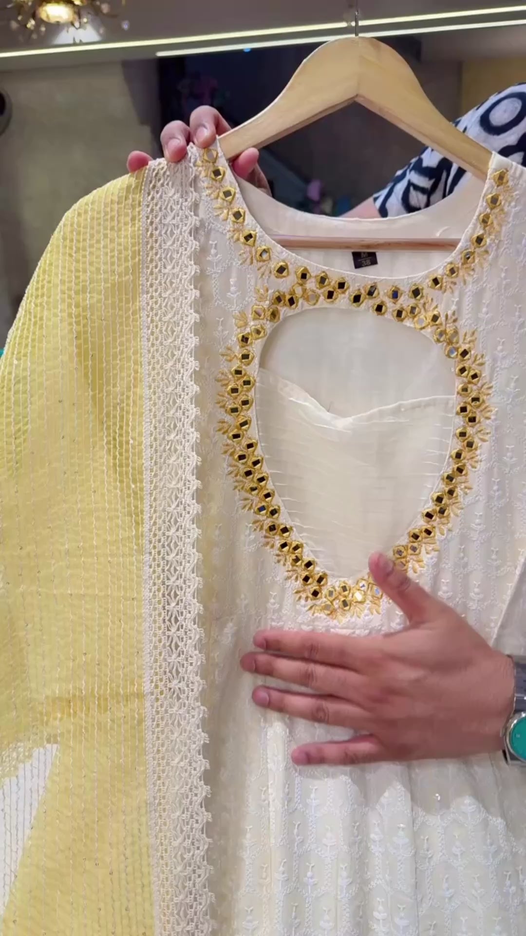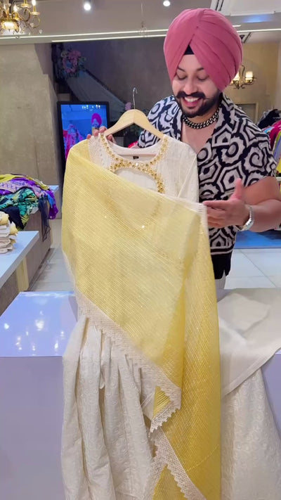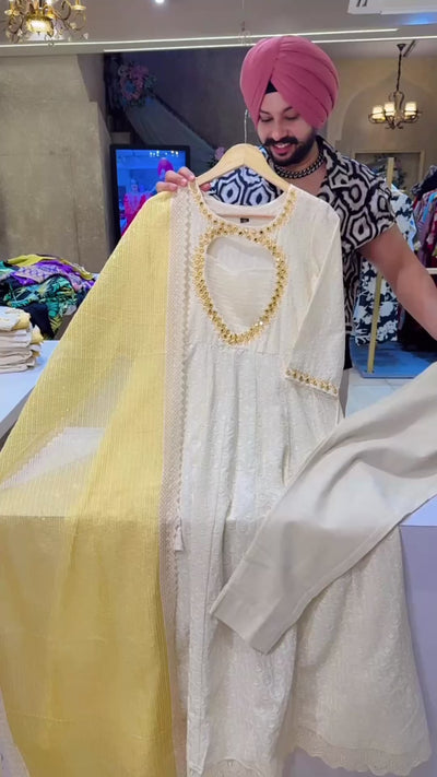 Off White & yellow Cotton Fully embroidered & Self Sequins Partywear Summerish Anarkali with Mirror work on Designer Neck