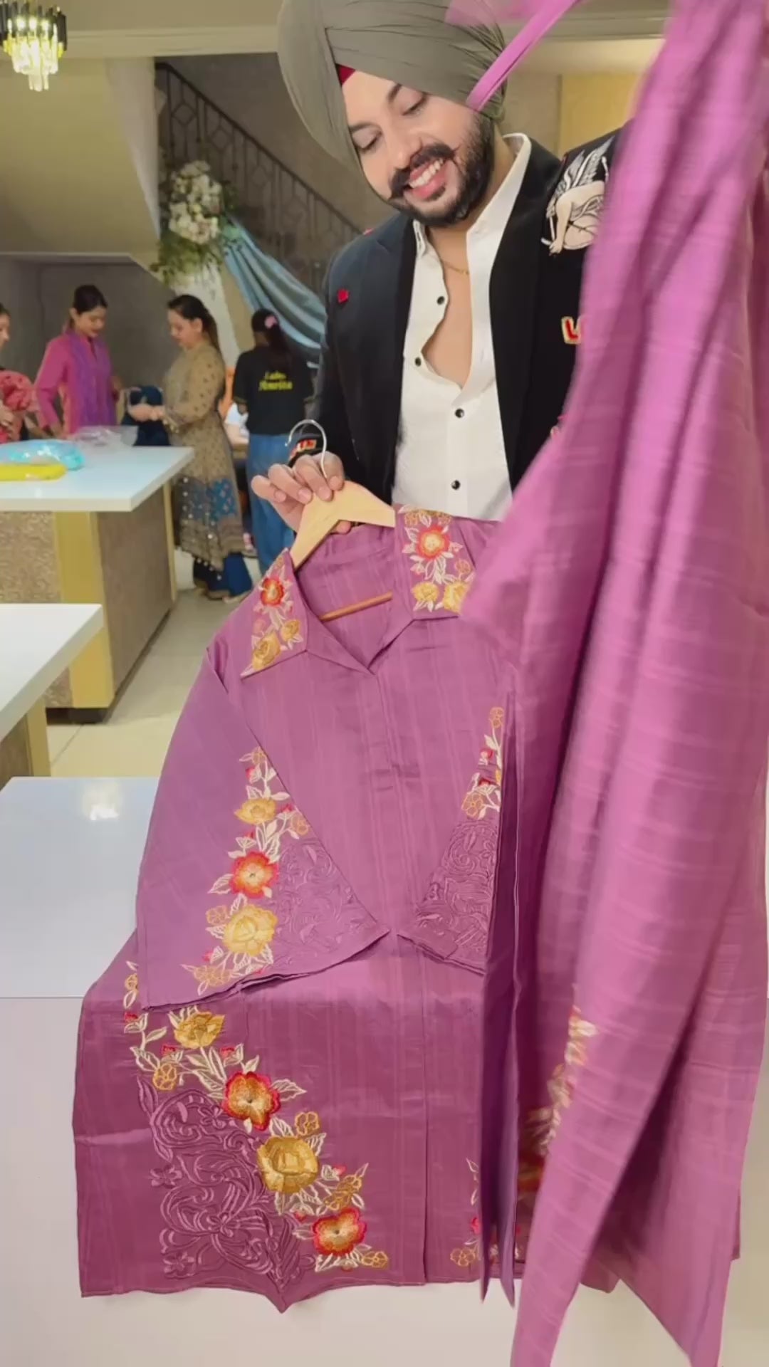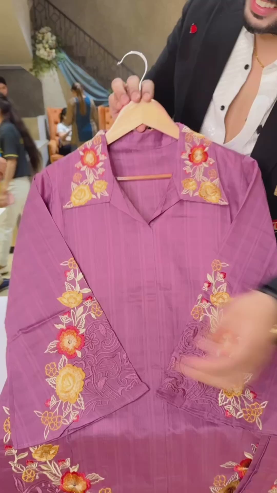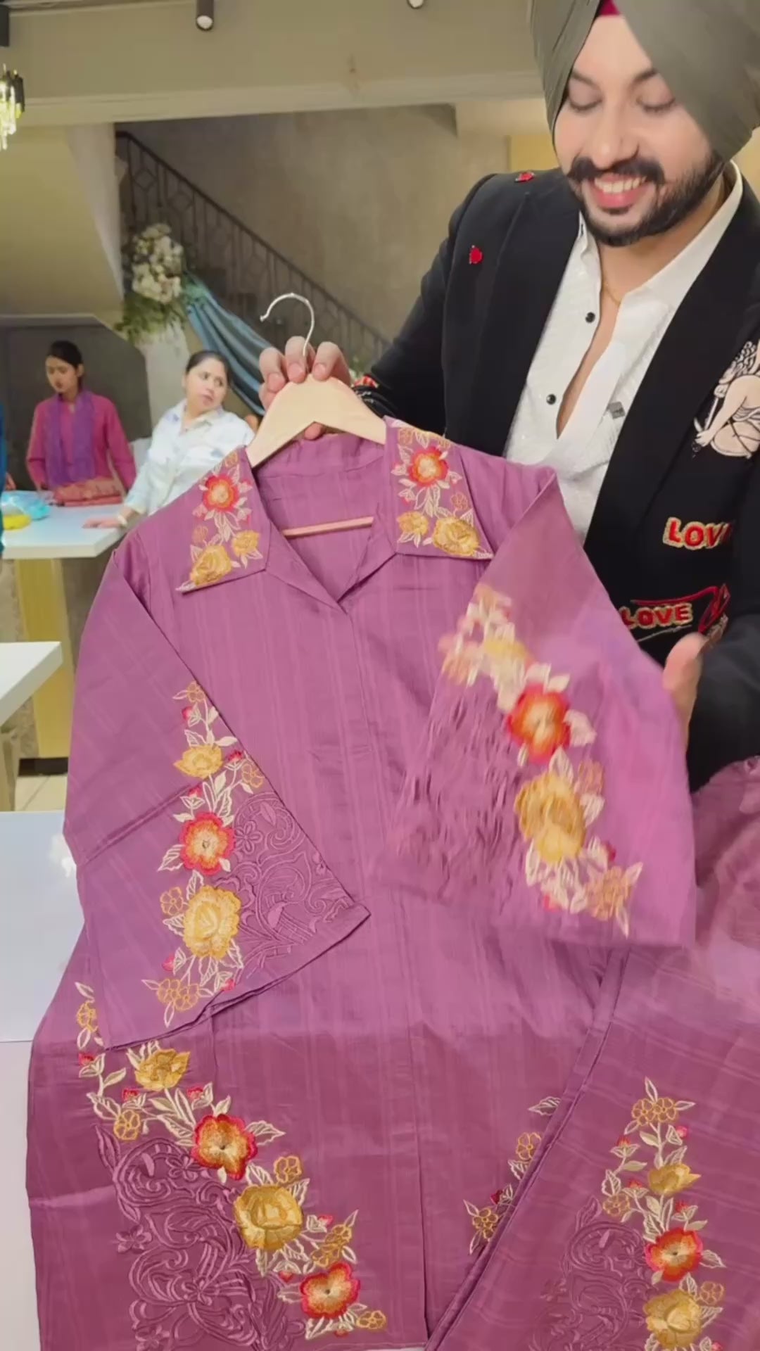 Onion pink Collar neck imported Silk Embroidered Coord set with Stylish Plazo