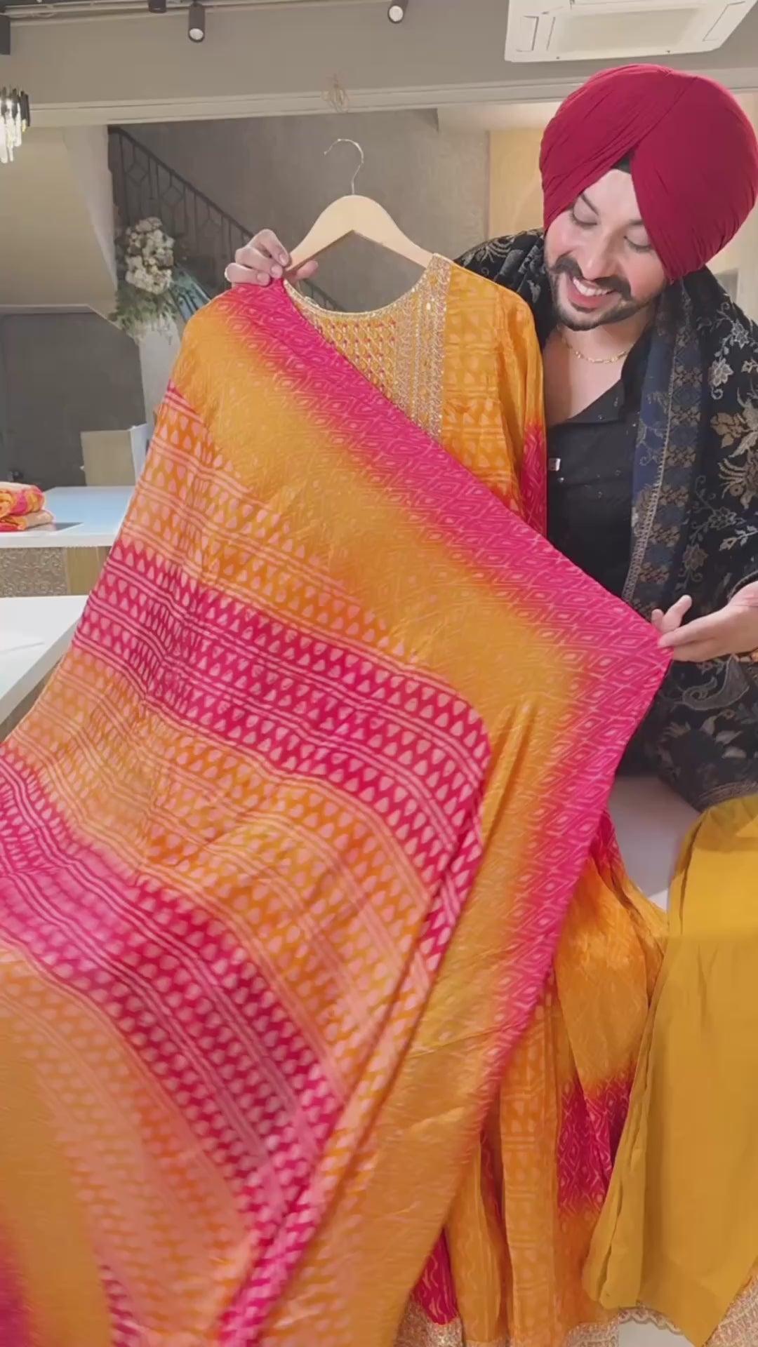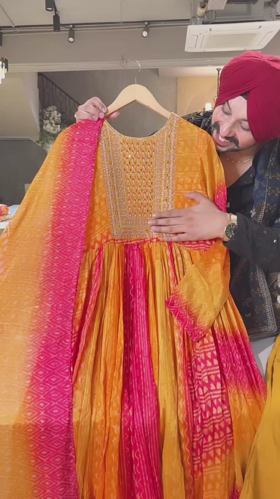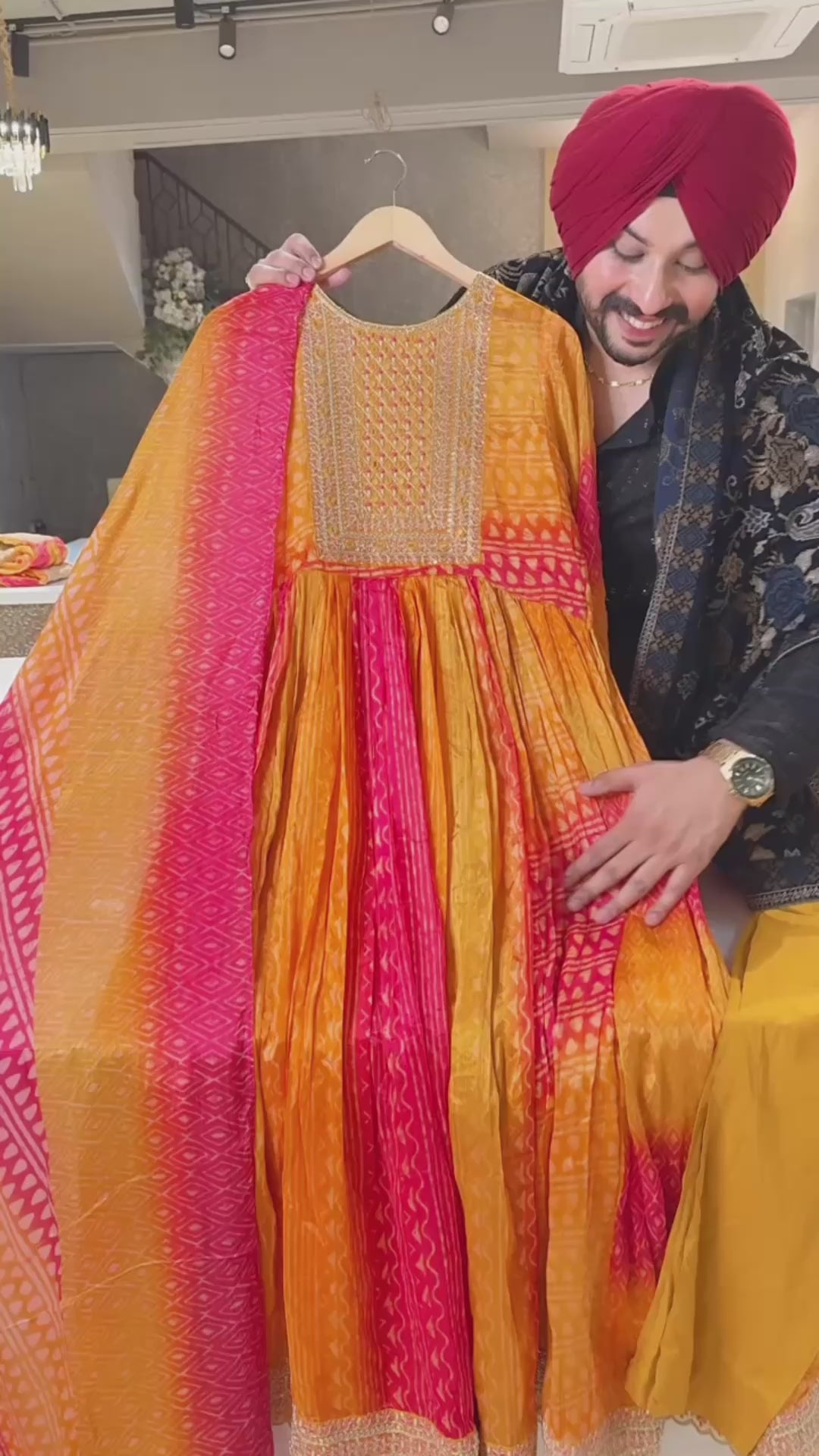 Yellowish orange & Rani Chinon Full Flair Embroidered Anarkali Suit
