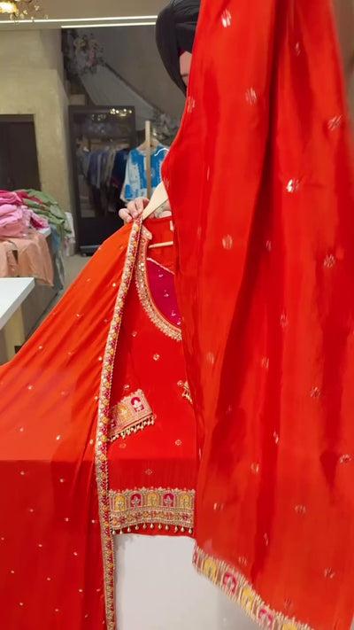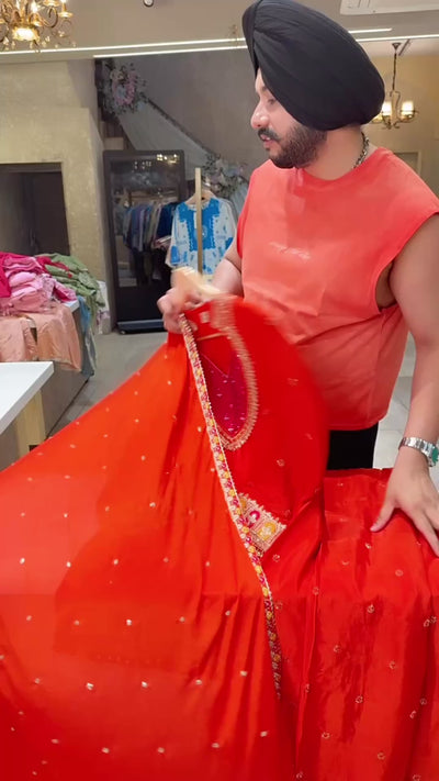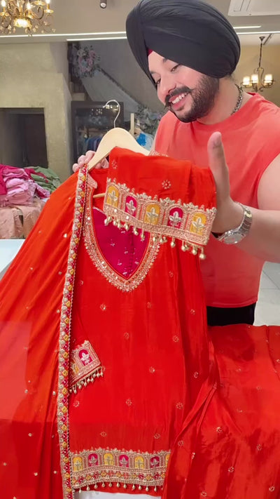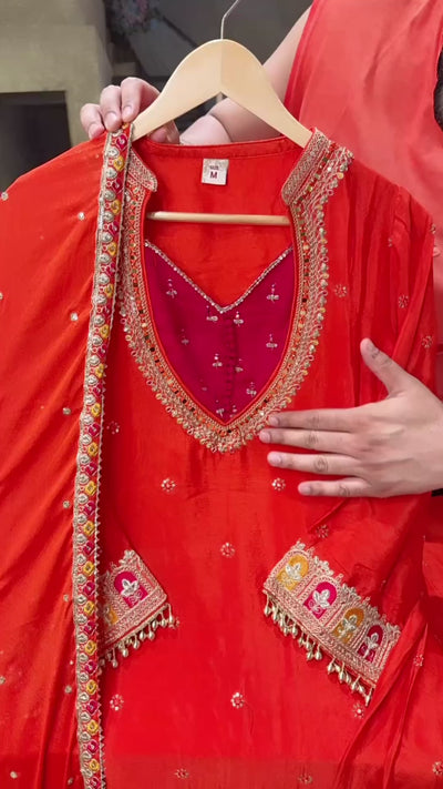 Orange Chinon Designer Neck Indowestern Party Wear Suit