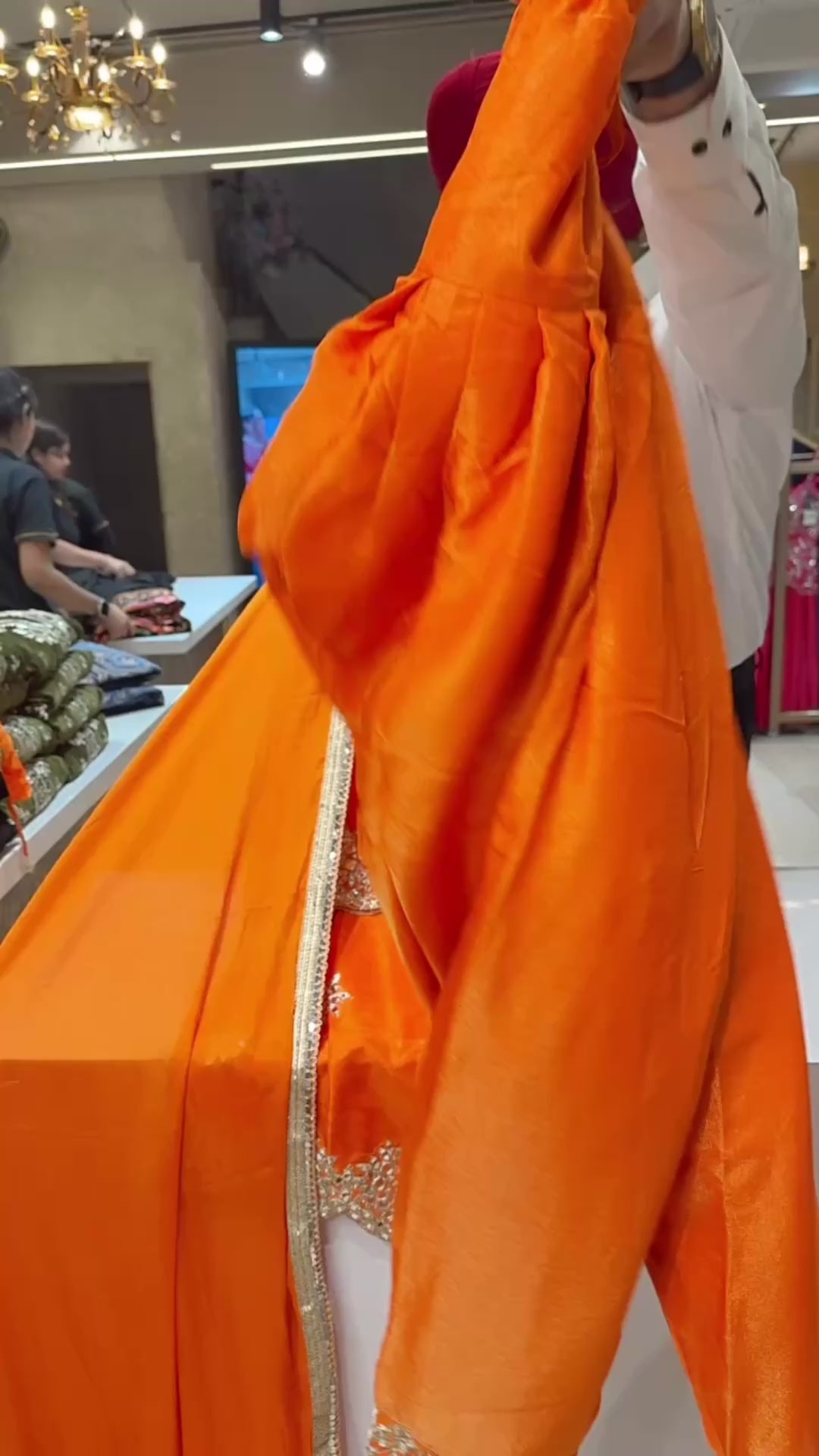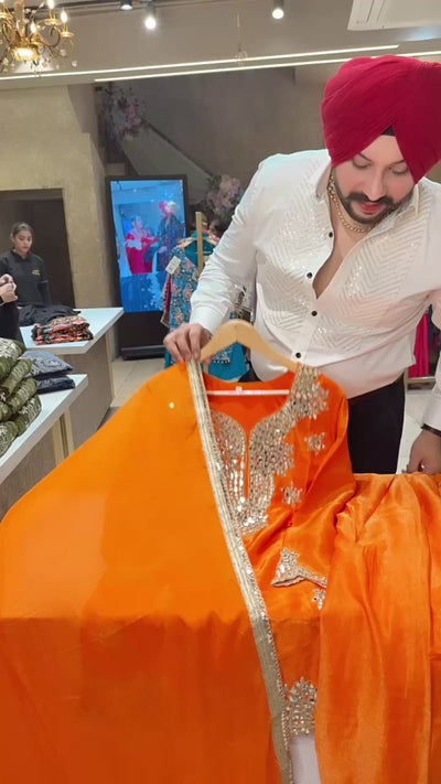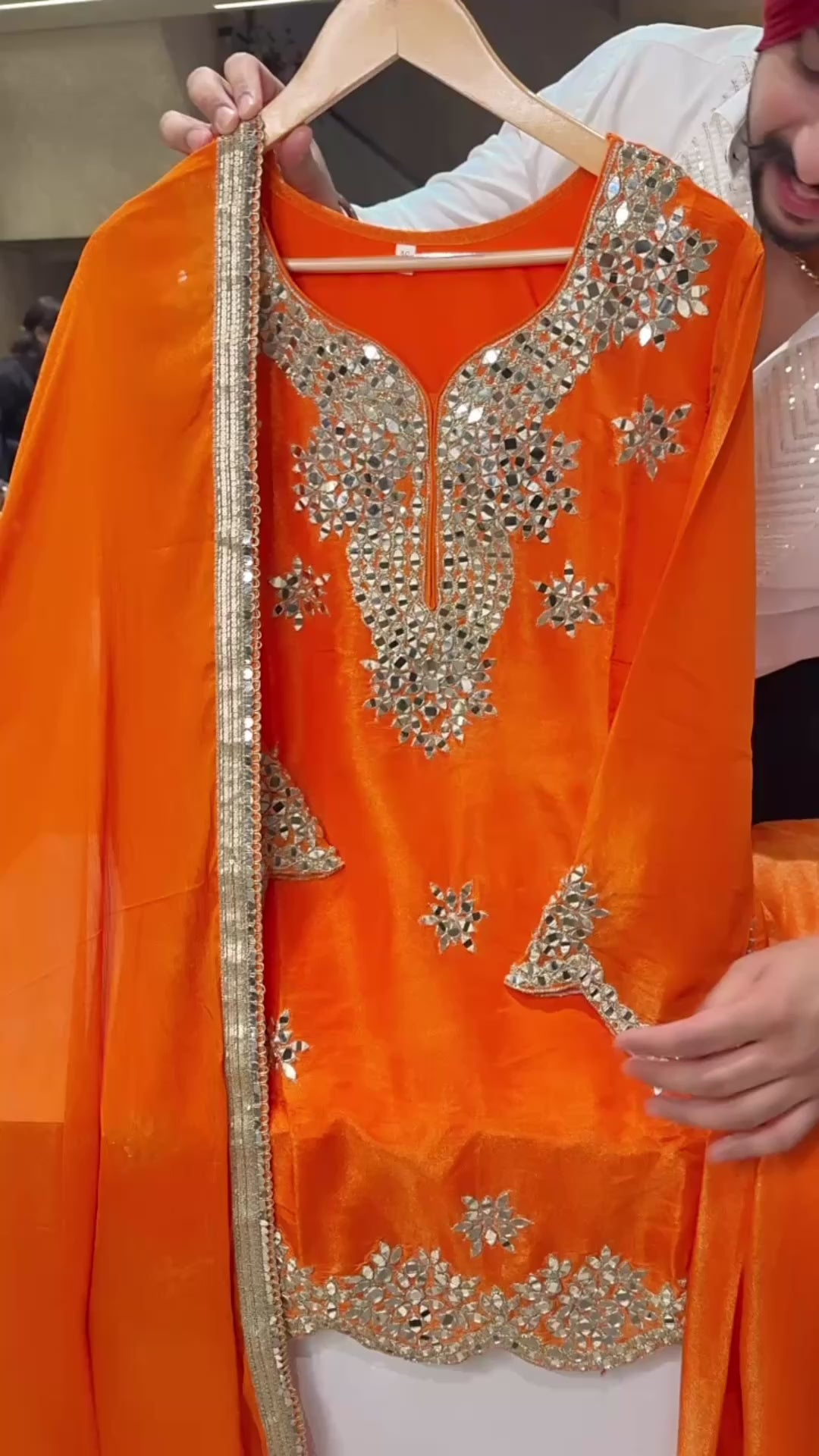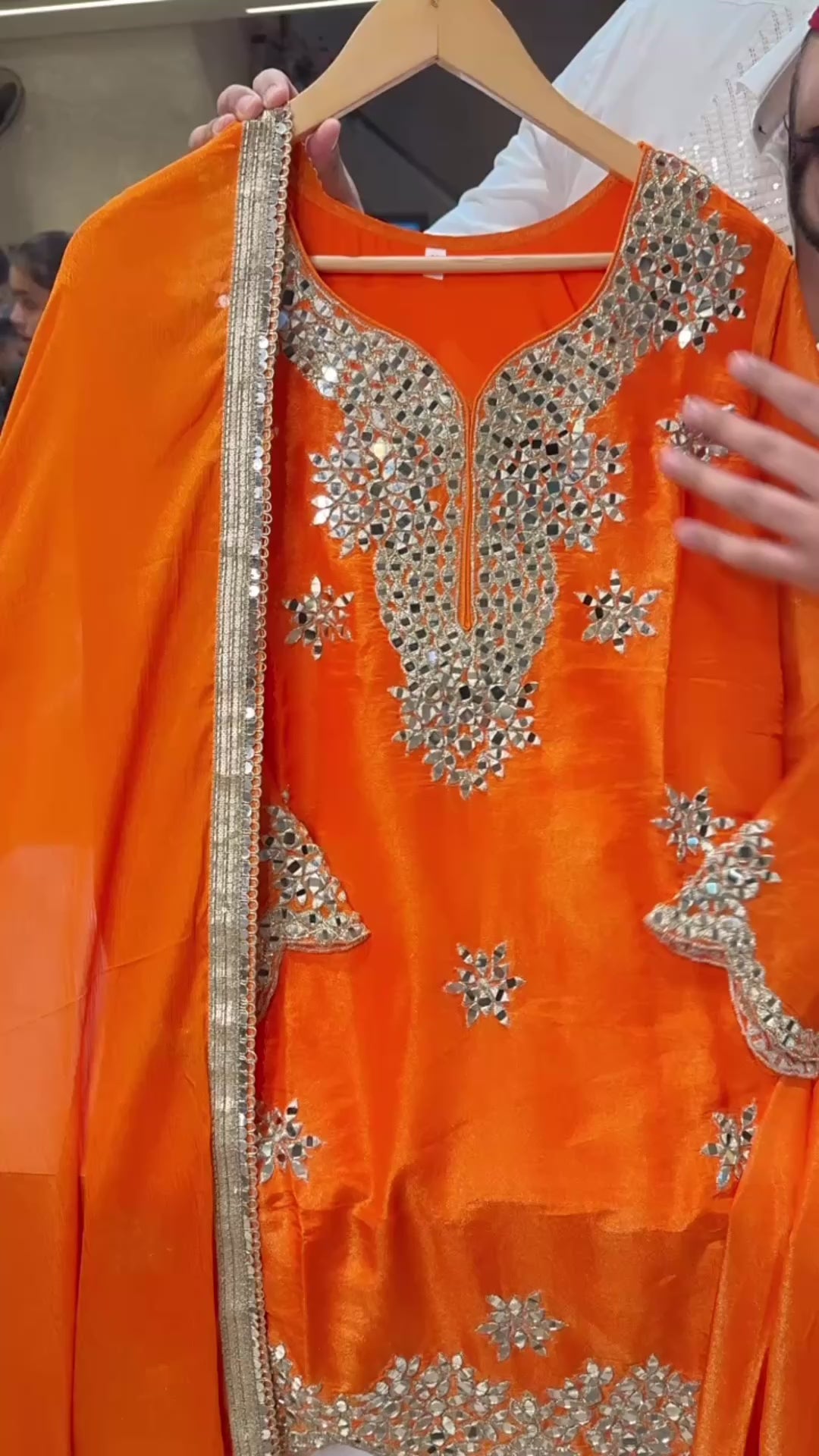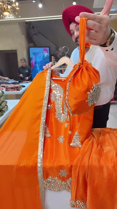 Orange Shimmer Silk Heavy mirror work PartyWear Salwar Suit with Cute Potli