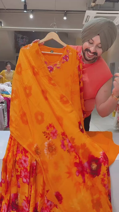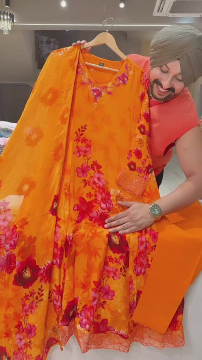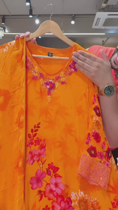 Orange Georgette Floral print A-line Suit with Hand Embroidery work on neck & Sleek Duppata