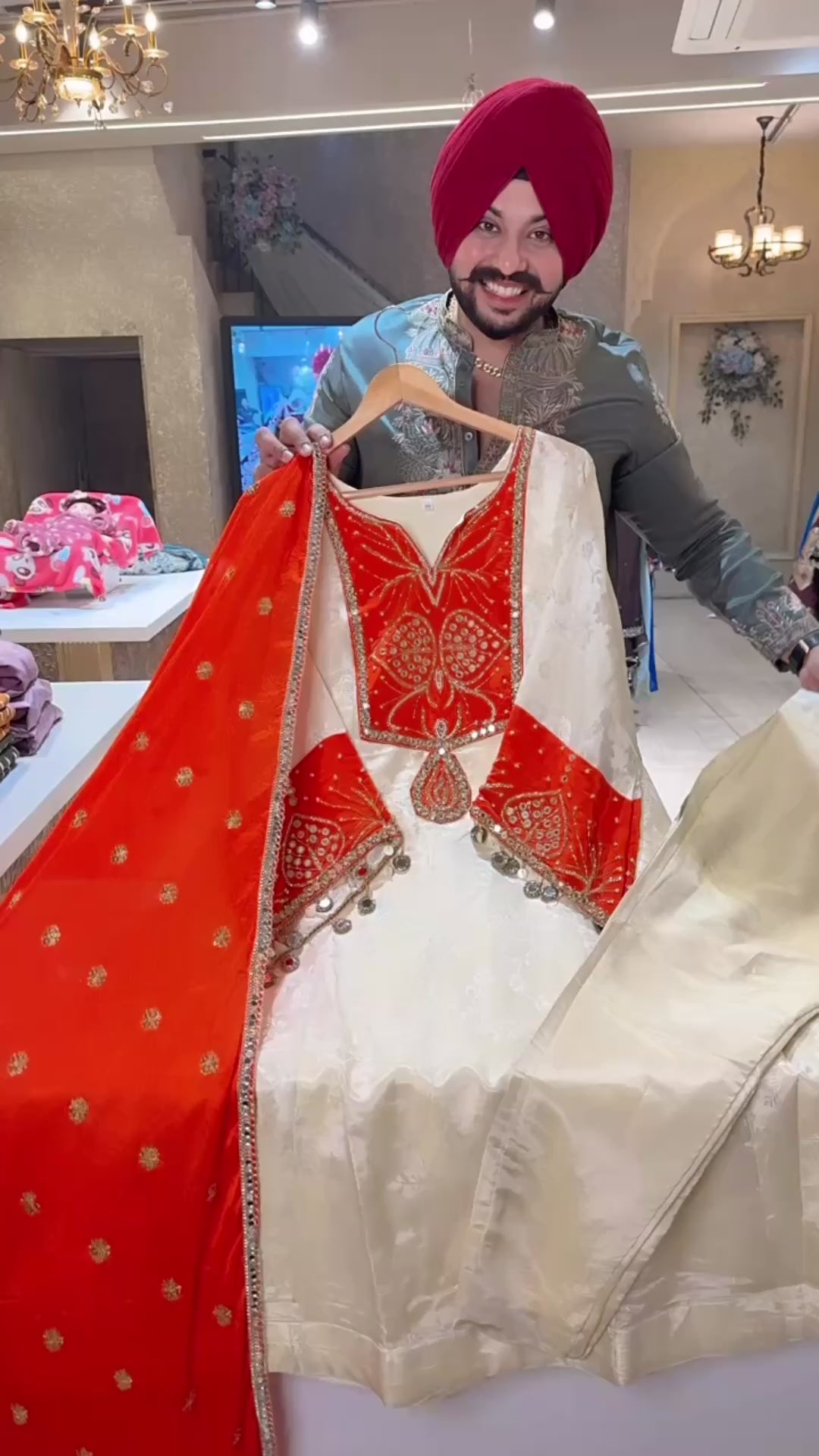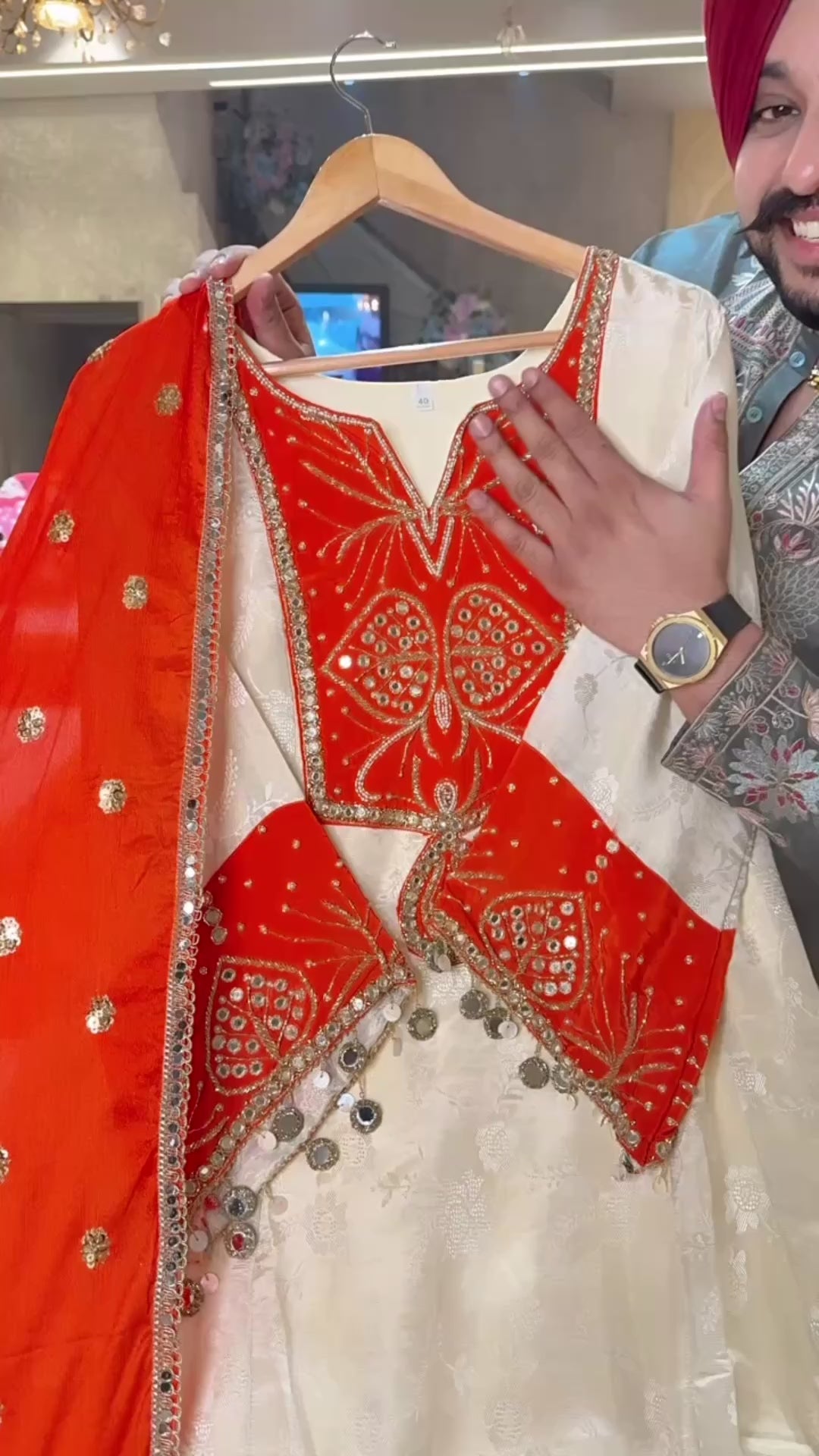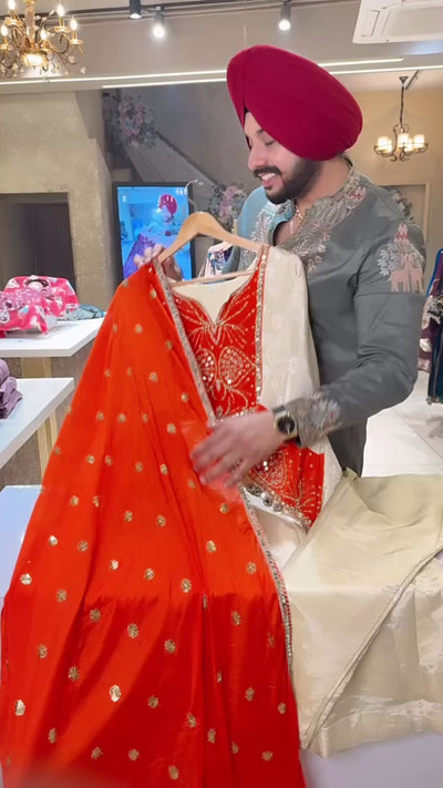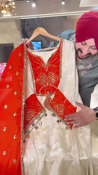 Orange Goldenish Cream Jaquard Silk Hand embroidered Bell Sleeves Anarkali Suit with Beautiful Chinon Sequins work Duppata