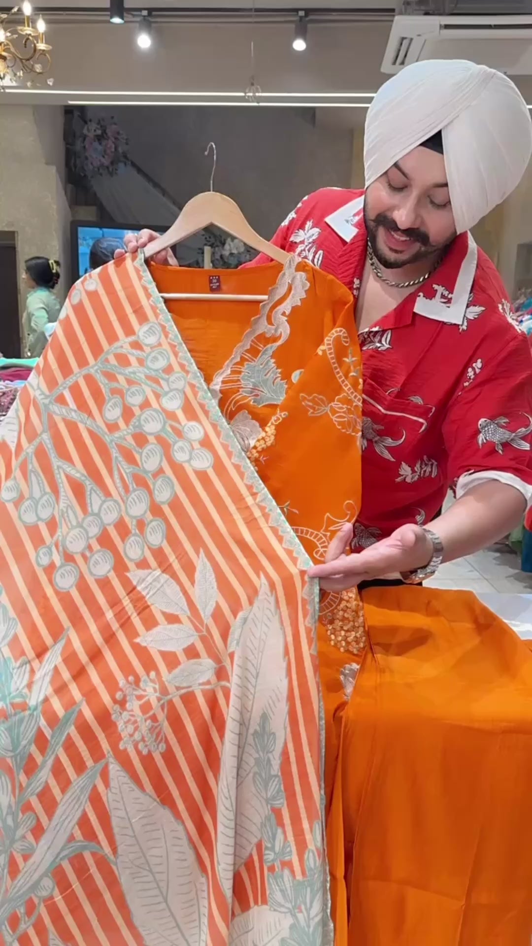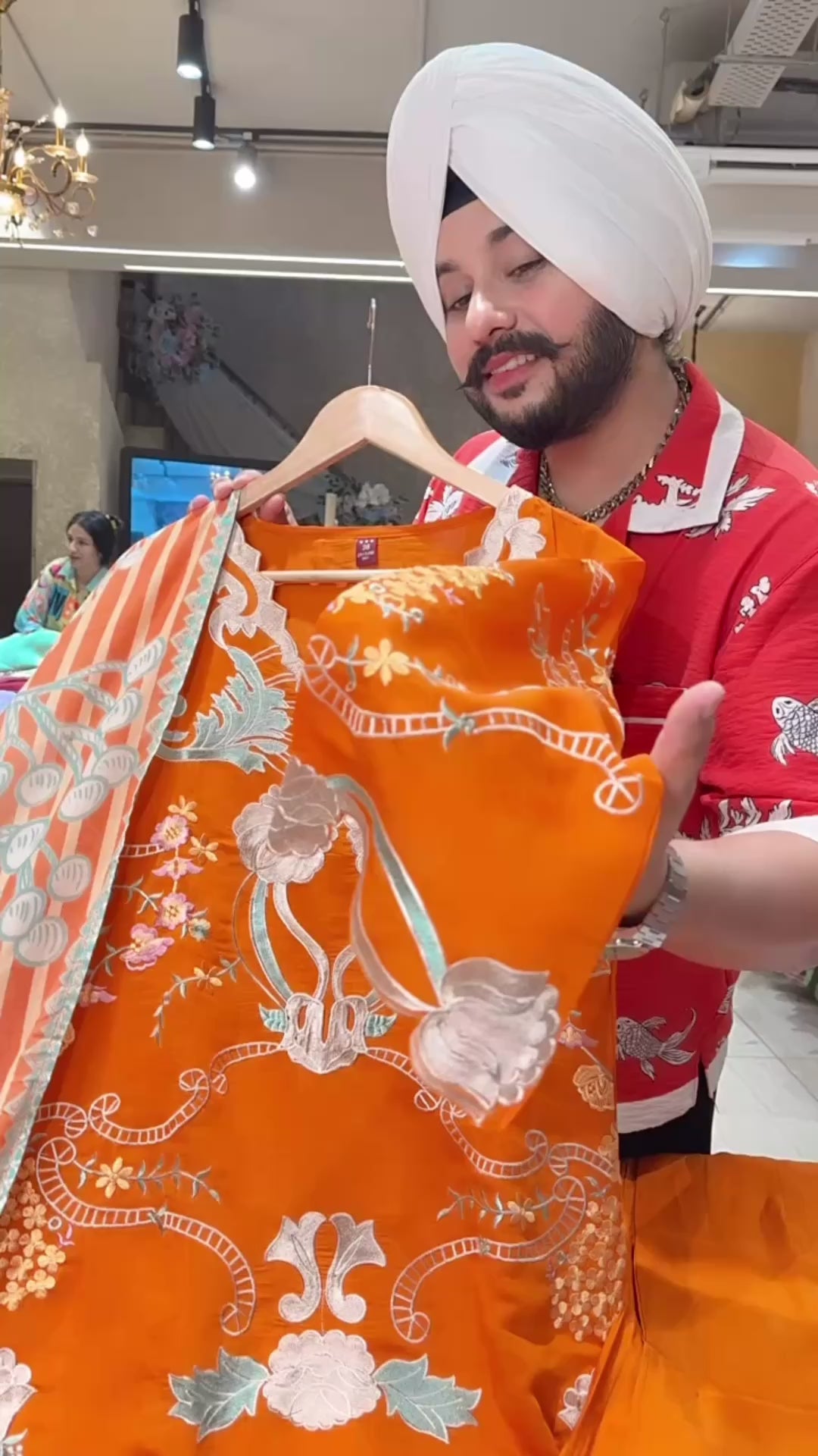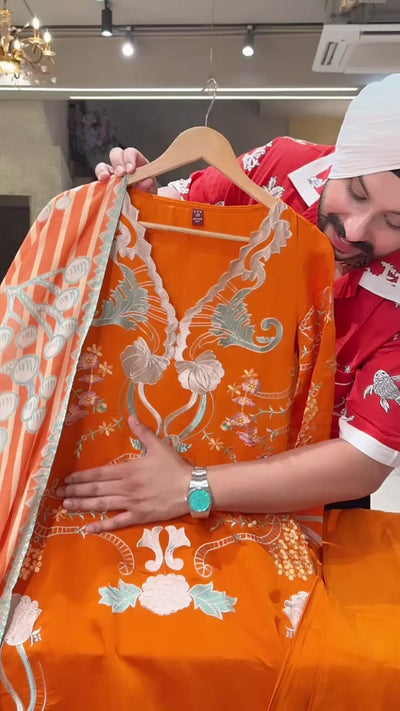 Orange Mal Chanderi Fully Floral Embroidered Kashmiri Suit with Soft Leaf Print Duppata