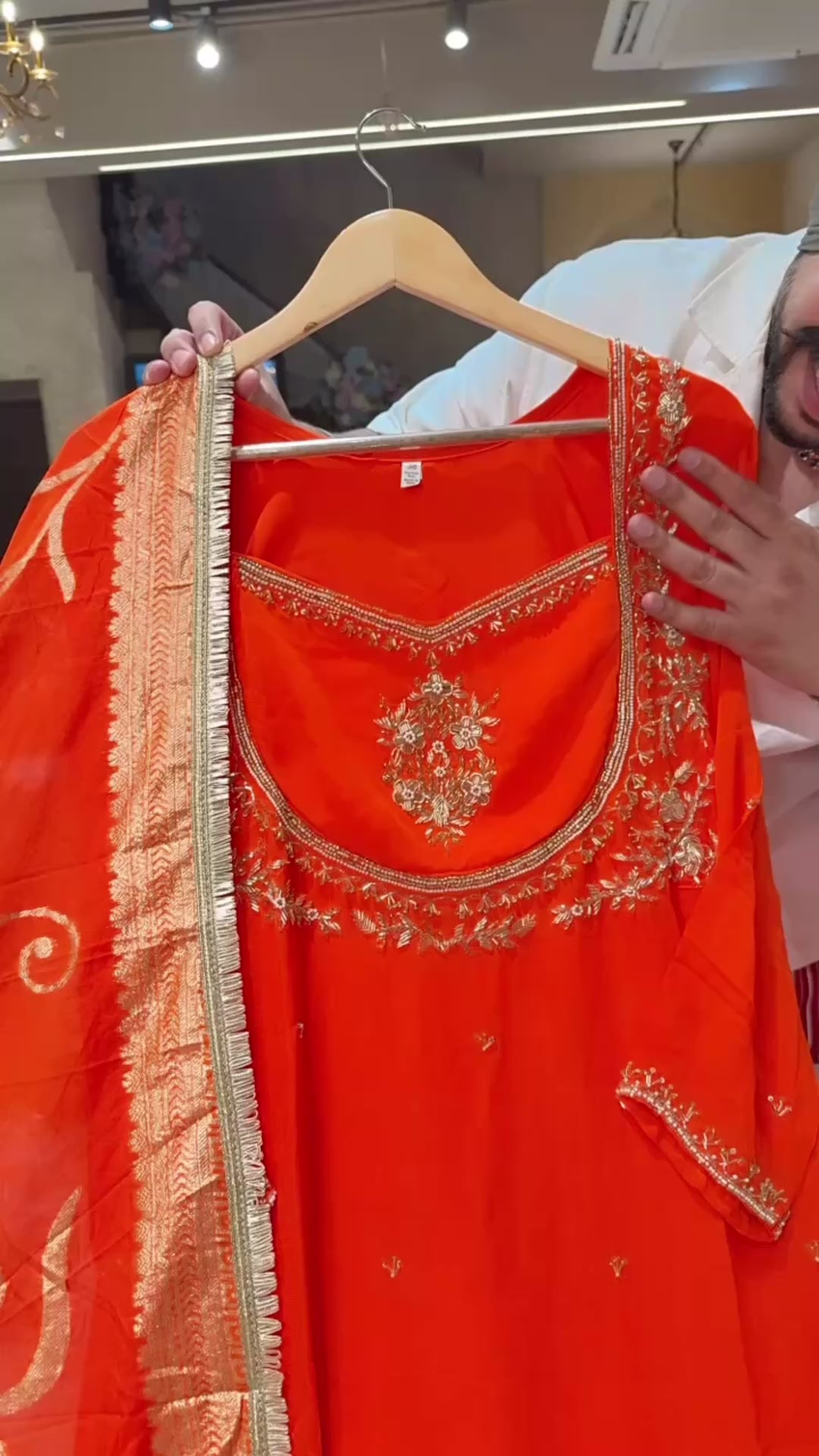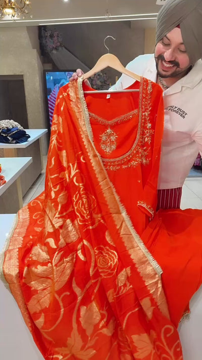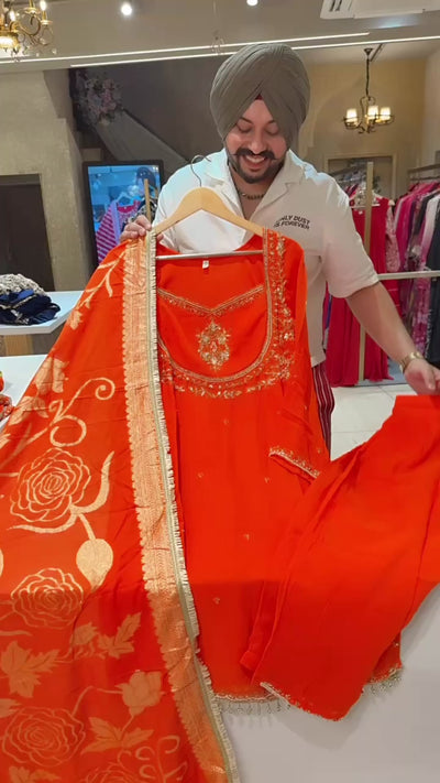 Orange premium Georgette Heavy Hand embroidered Party wear Straight Suit with Banarasi Look Duppata