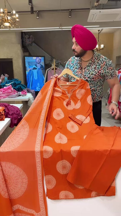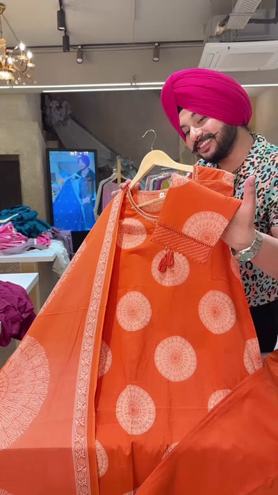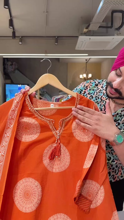 Orange Pure Cotton Office Wear Straight suit with sleek embroidery work on neck