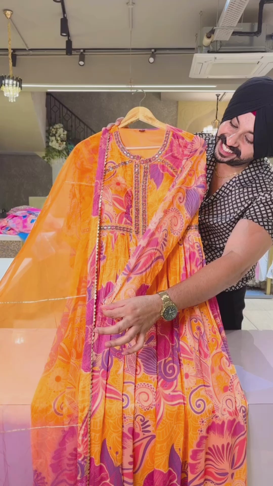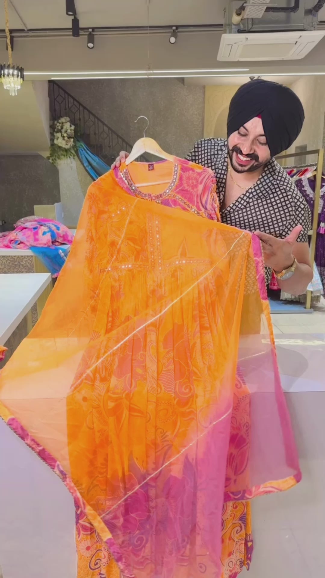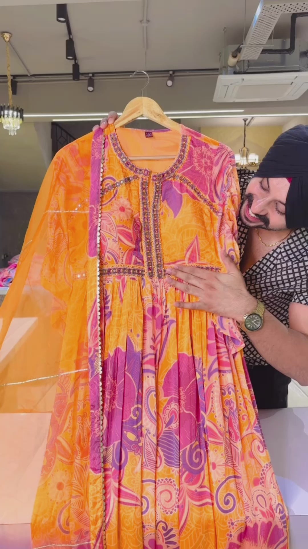 Orange yellow Chinon Hand embroidered Padded Anarkali Gown with beautiful organza Duppata