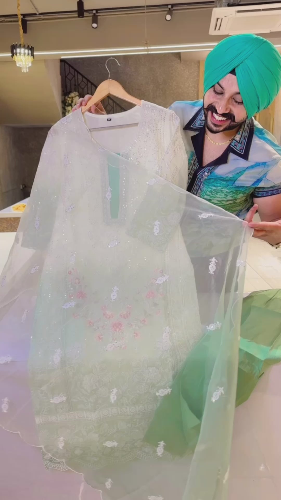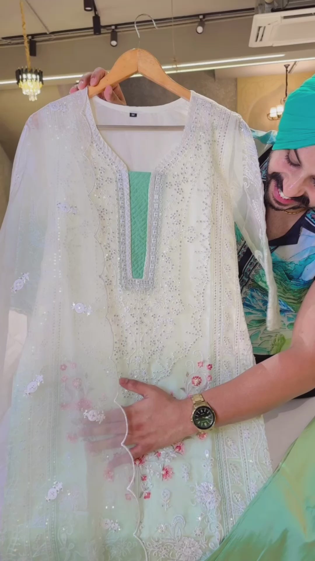 Moon white & green Organza Pakistani heavy Embroidered Suit
