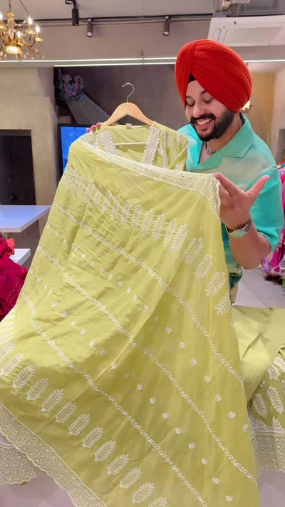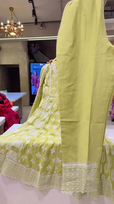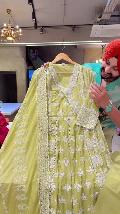 Pastel Green Mal Cotton Full Flair Fully embroidered Angrakha Anarkali suit