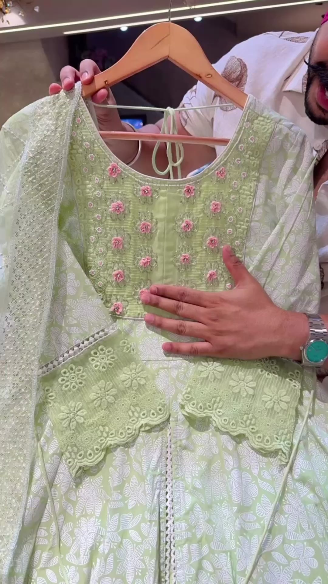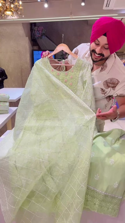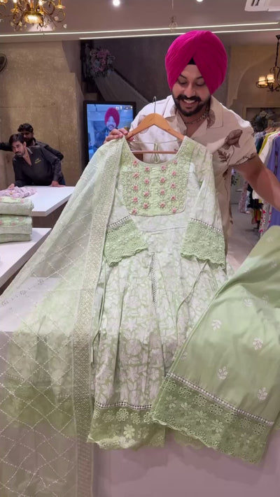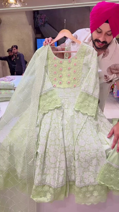 Pastel green Pure Cotton Front slit Girlish Anarkali Suit with Hand embroidery Work on neck & Beautiful Sequins work Organza Duppata