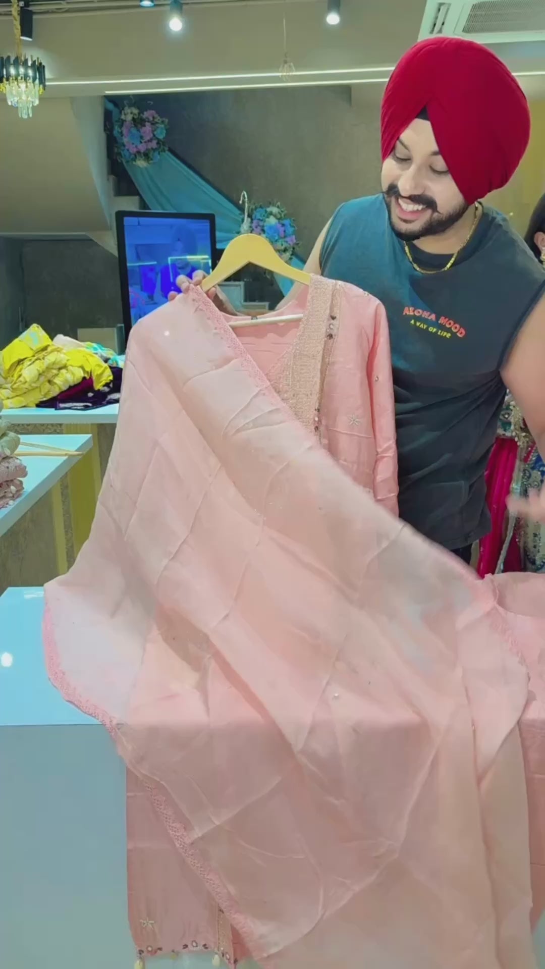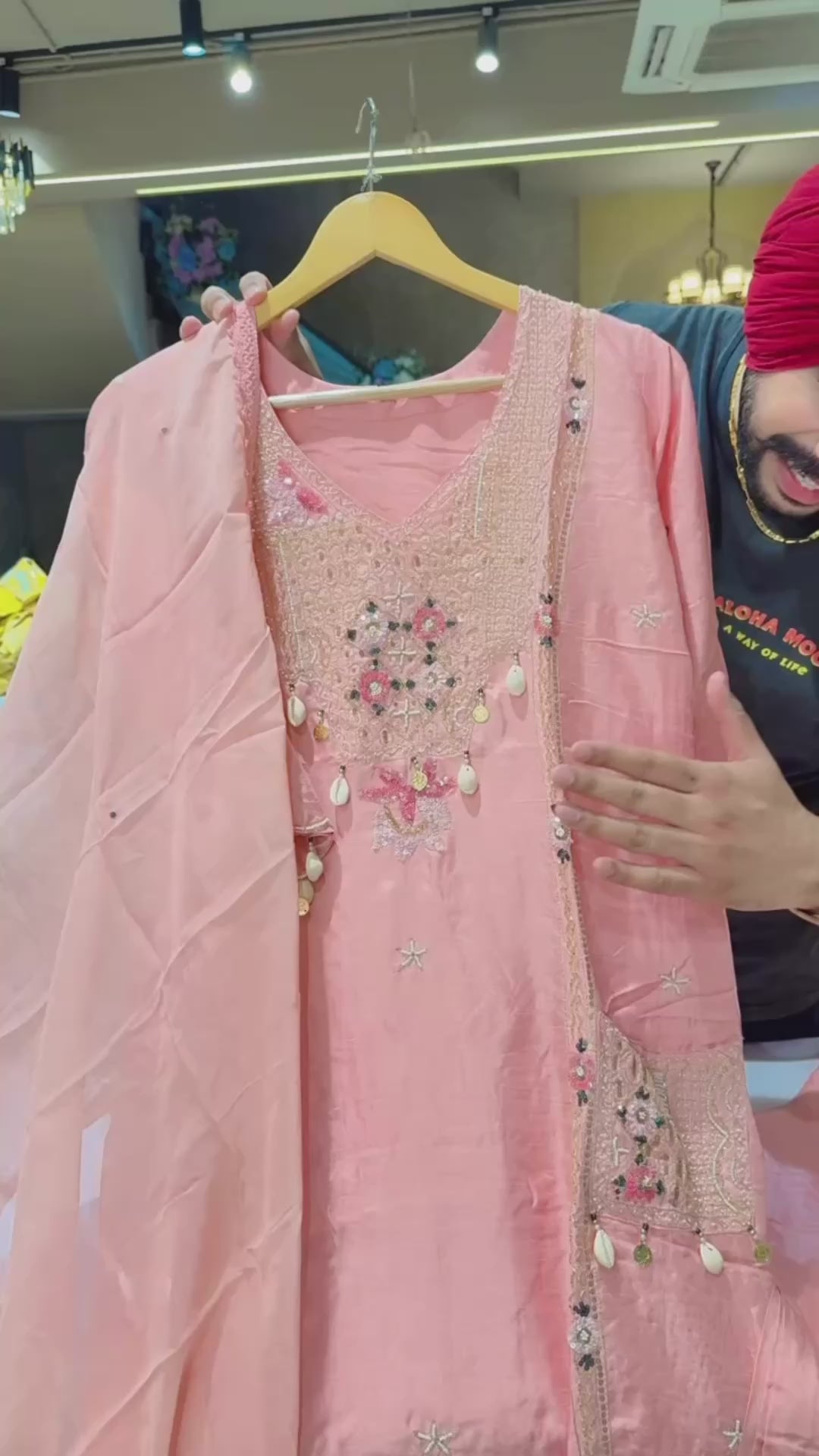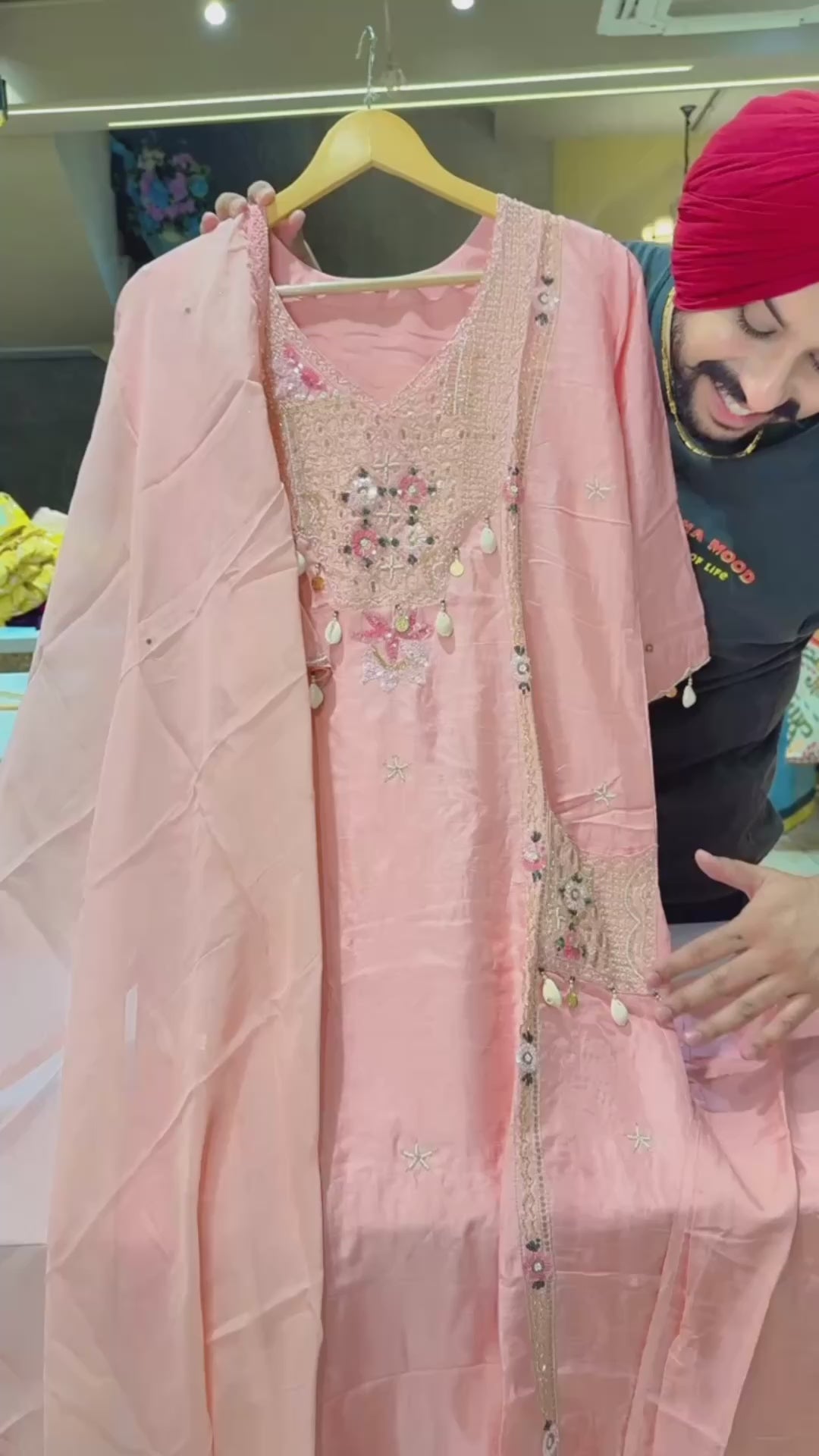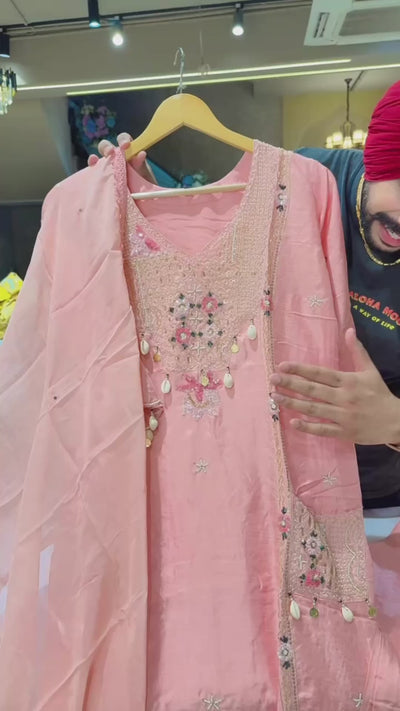 Pastel pink Dola silk heavy hand embroidered Straight suit with designer front pockets