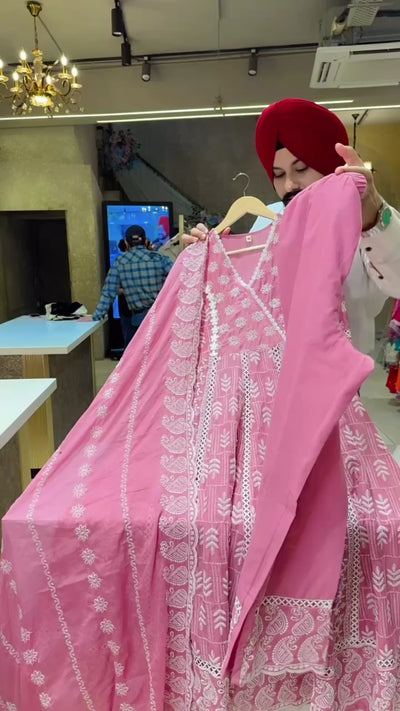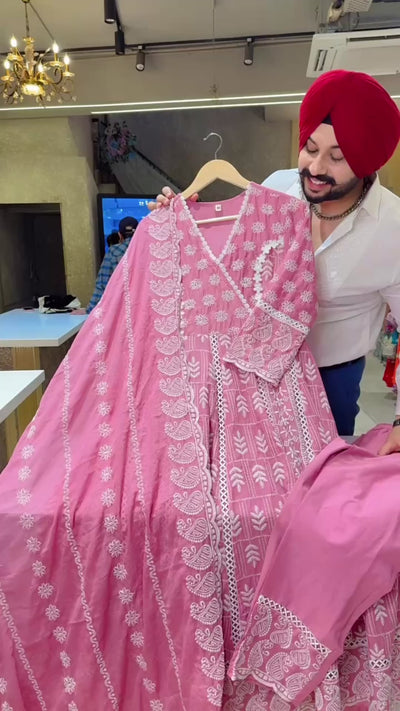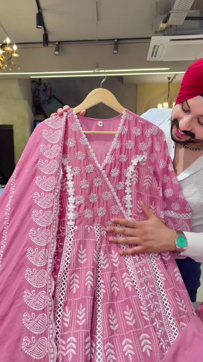 Pastel pink Mal Cotton Fully embroidered Full Flair Anarkali Suit with Beautiful Duppata