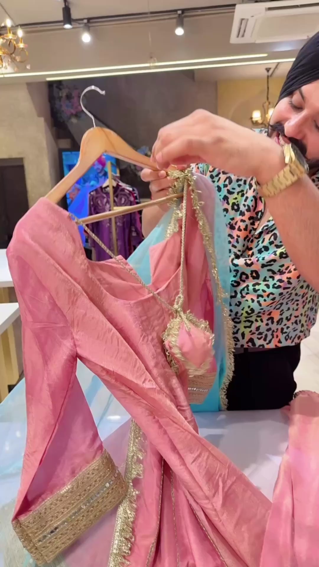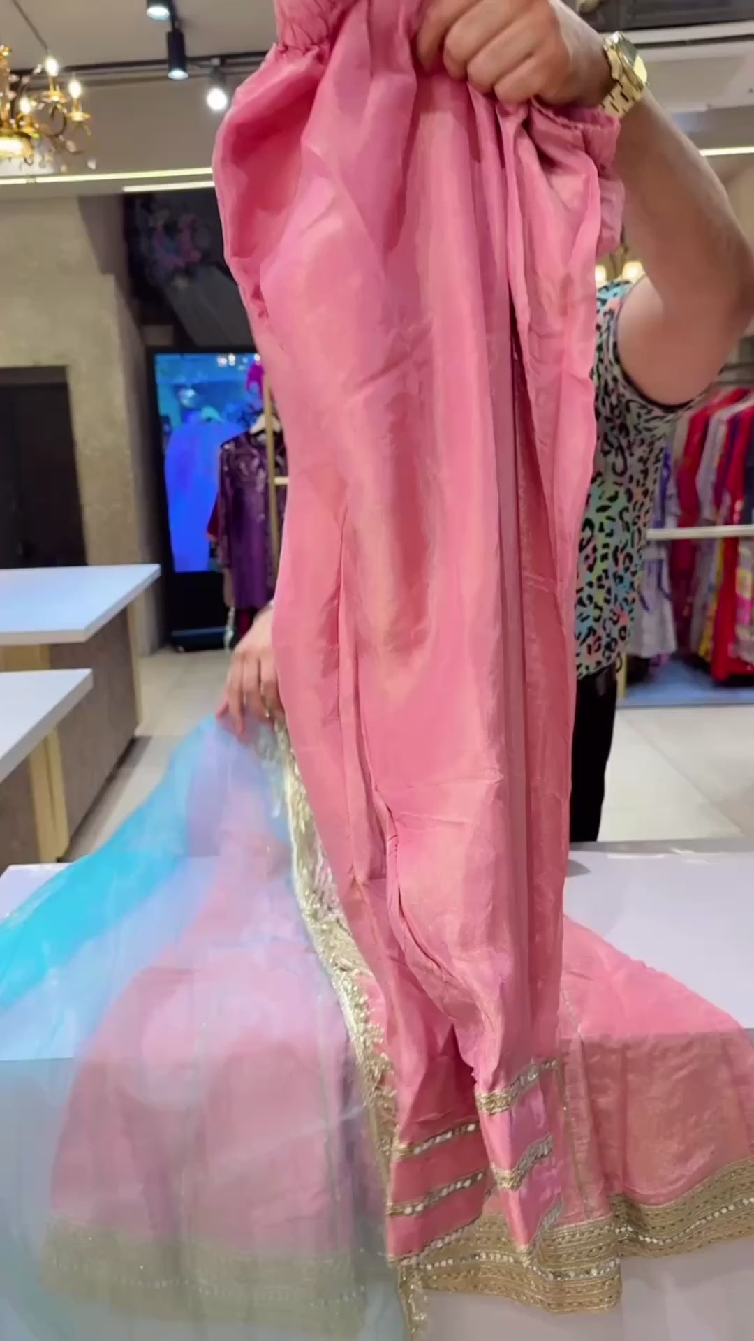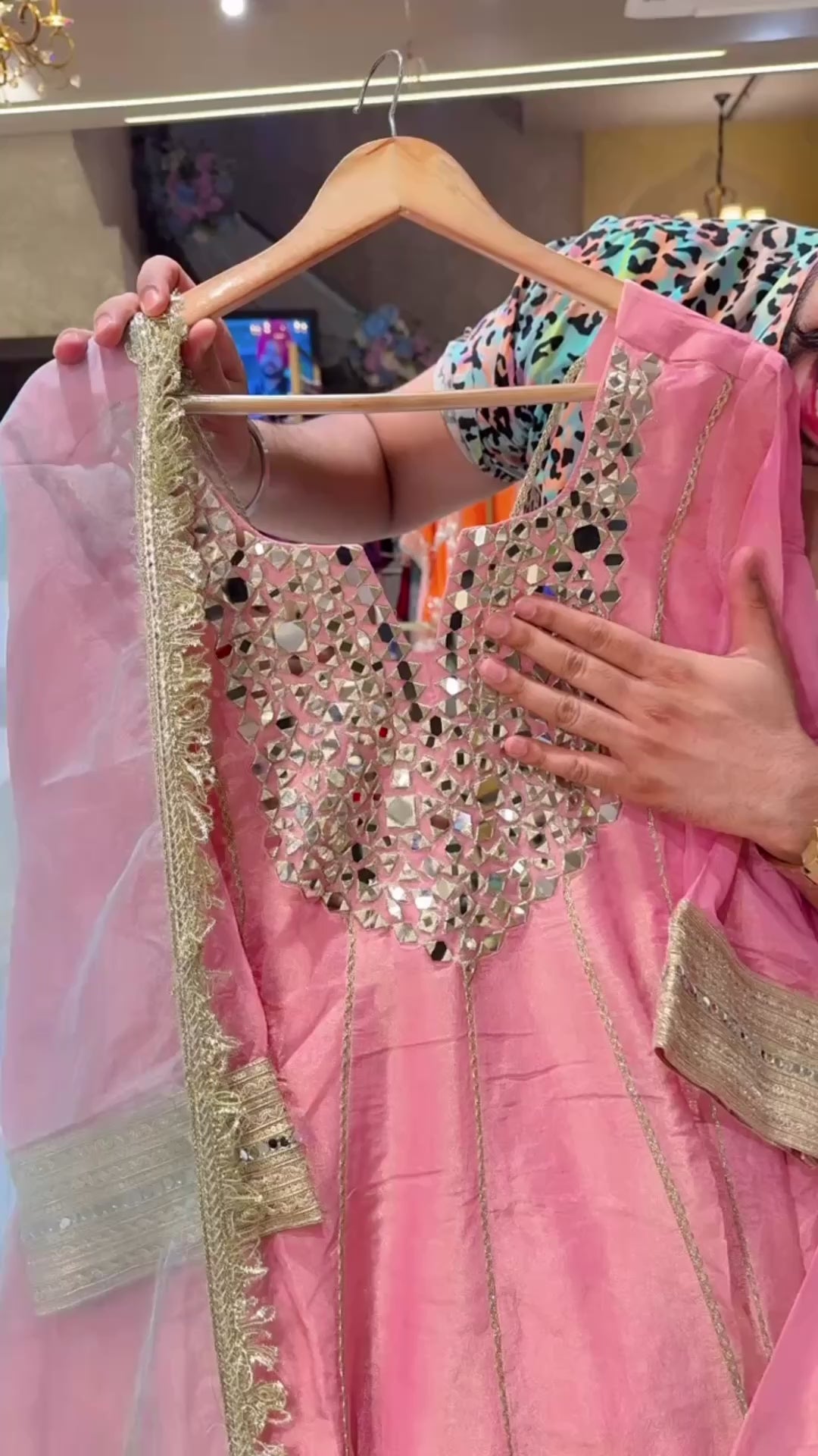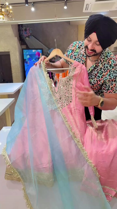 Pastel Pink Shimmer Silk Heavy Mirror Embroidered Semi Backless Paplum Farshi Salwar Set with Kiran Lace Sea Blue Organza Duppata
