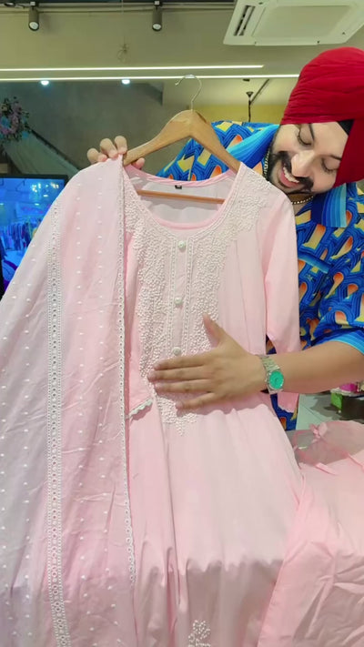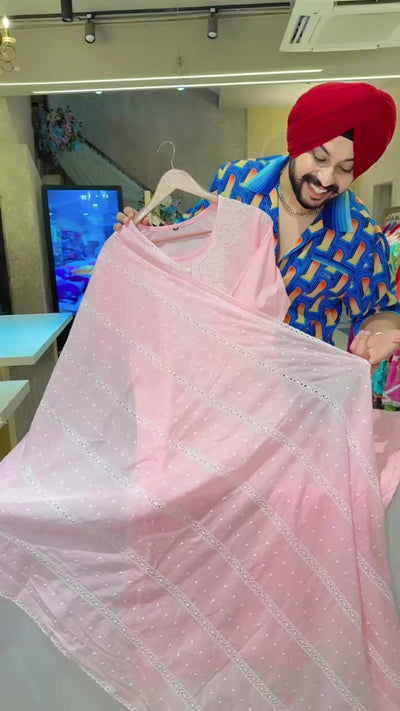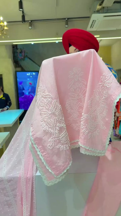 Pastel Pink Soft Cotton Lucknowi Style Embroidered Straight Suit with Fully Embroidered Duppata