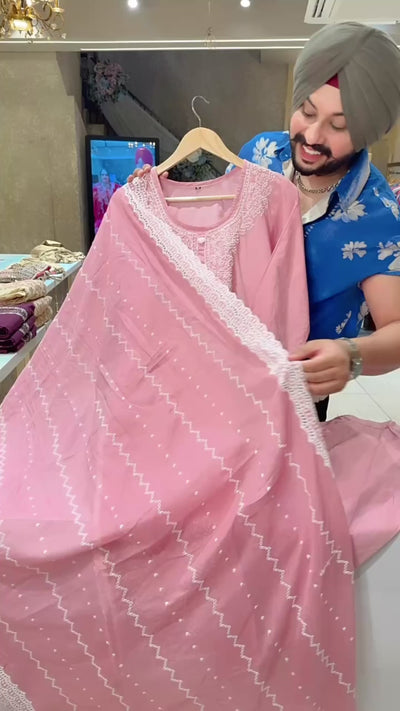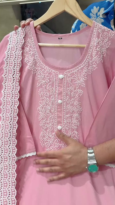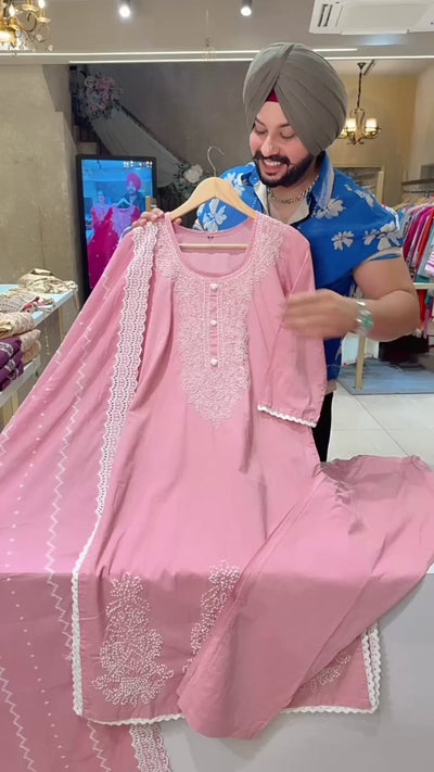 Pastel Pink Soft Cotton Lucknowi Style Embroidered Straight Suit with Fully Embroidered Duppata
