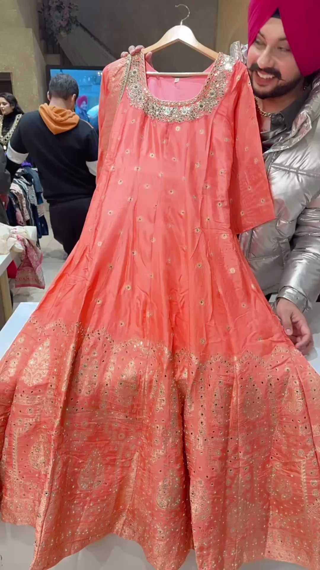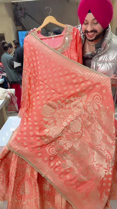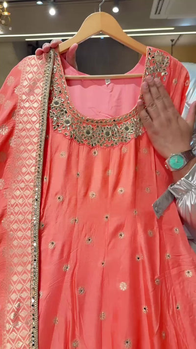 Peach Colour Soft Silk Full Flair Hand Embroidered & Mirror Pasting Anarkali Gown With Heavy Banarasi Border & Duppata