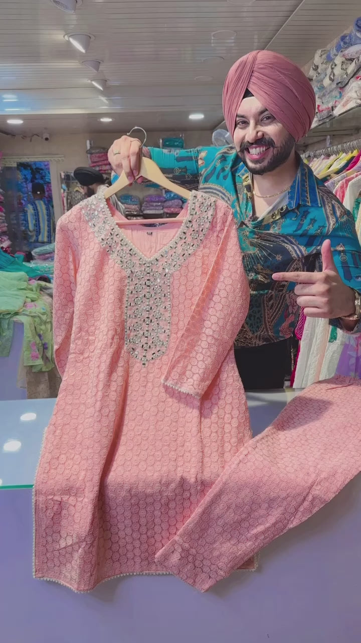 Peach crochet Lace Coord set with beautiful Mirror work on neck.