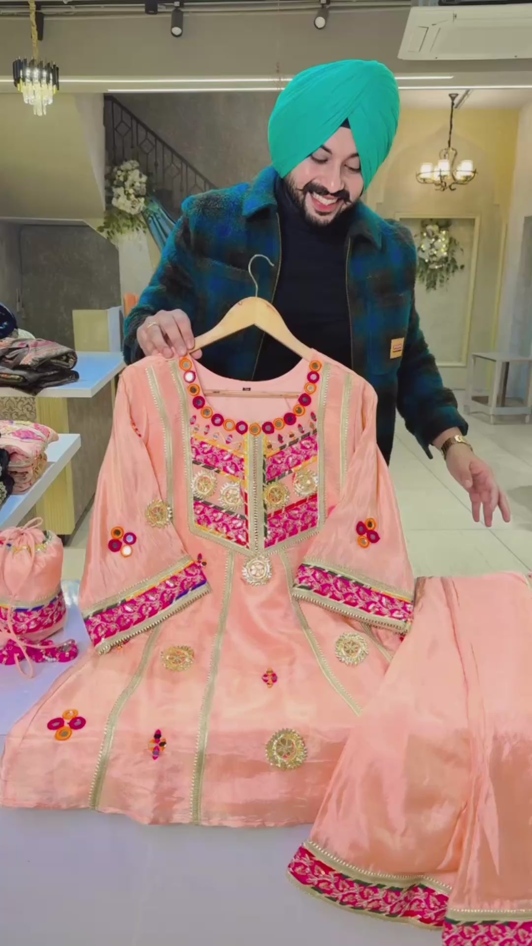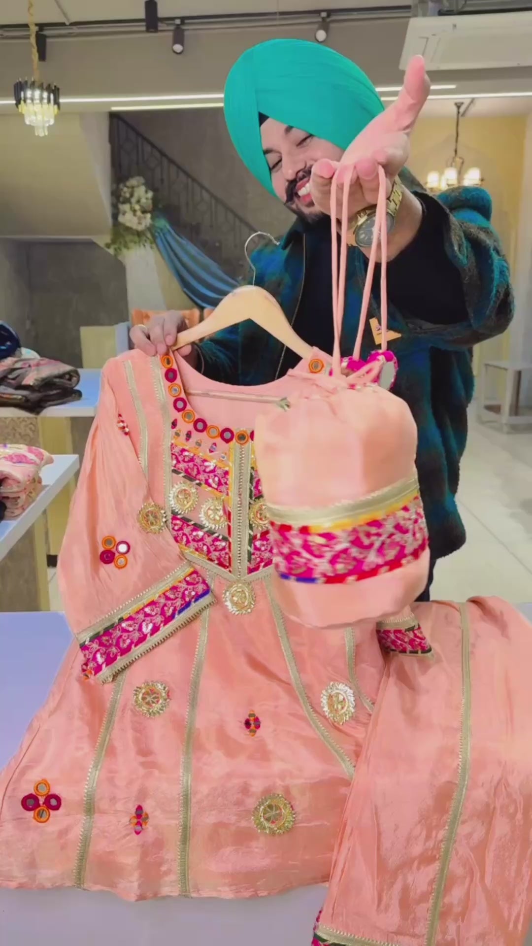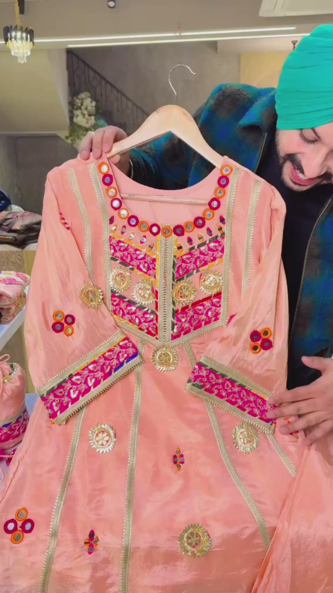 Peach Shimmer silk Tissue Gotta & mirror embroidered Paplum Coord set with Potli