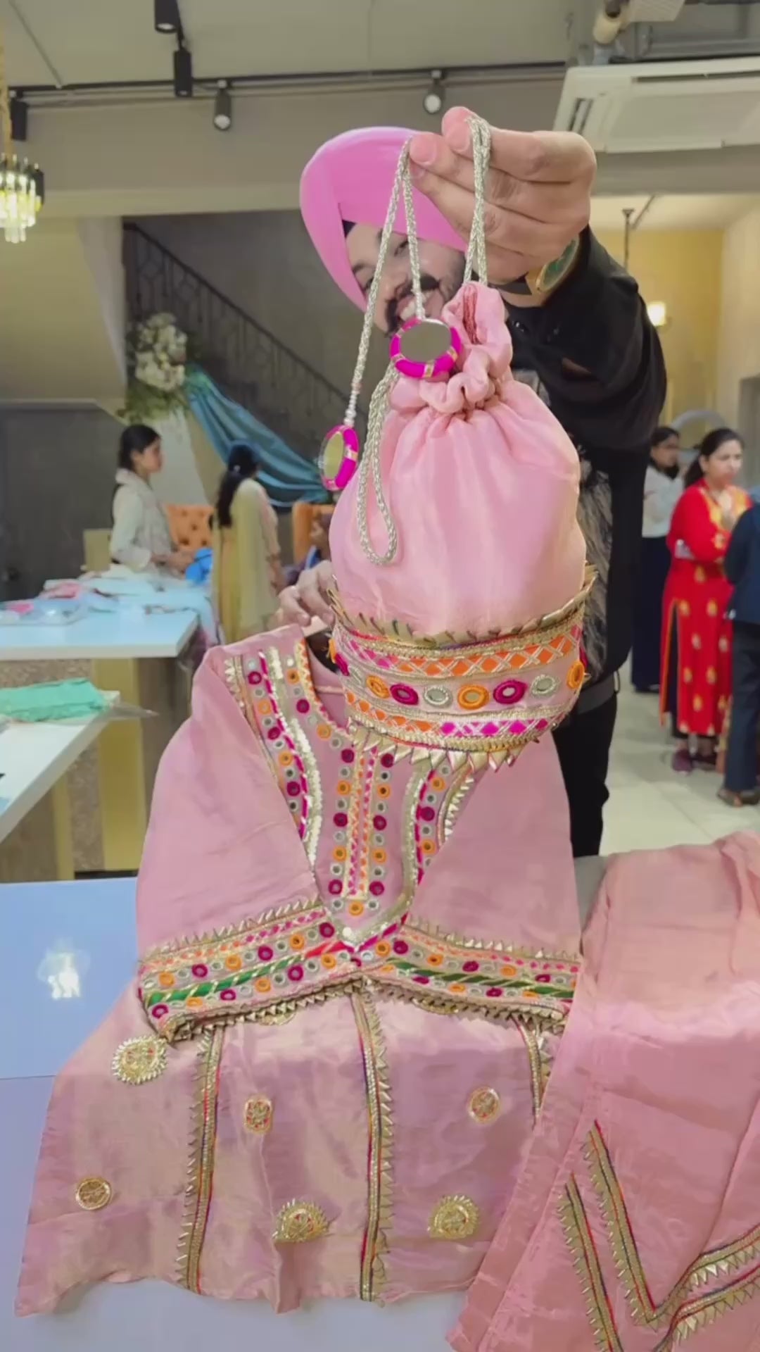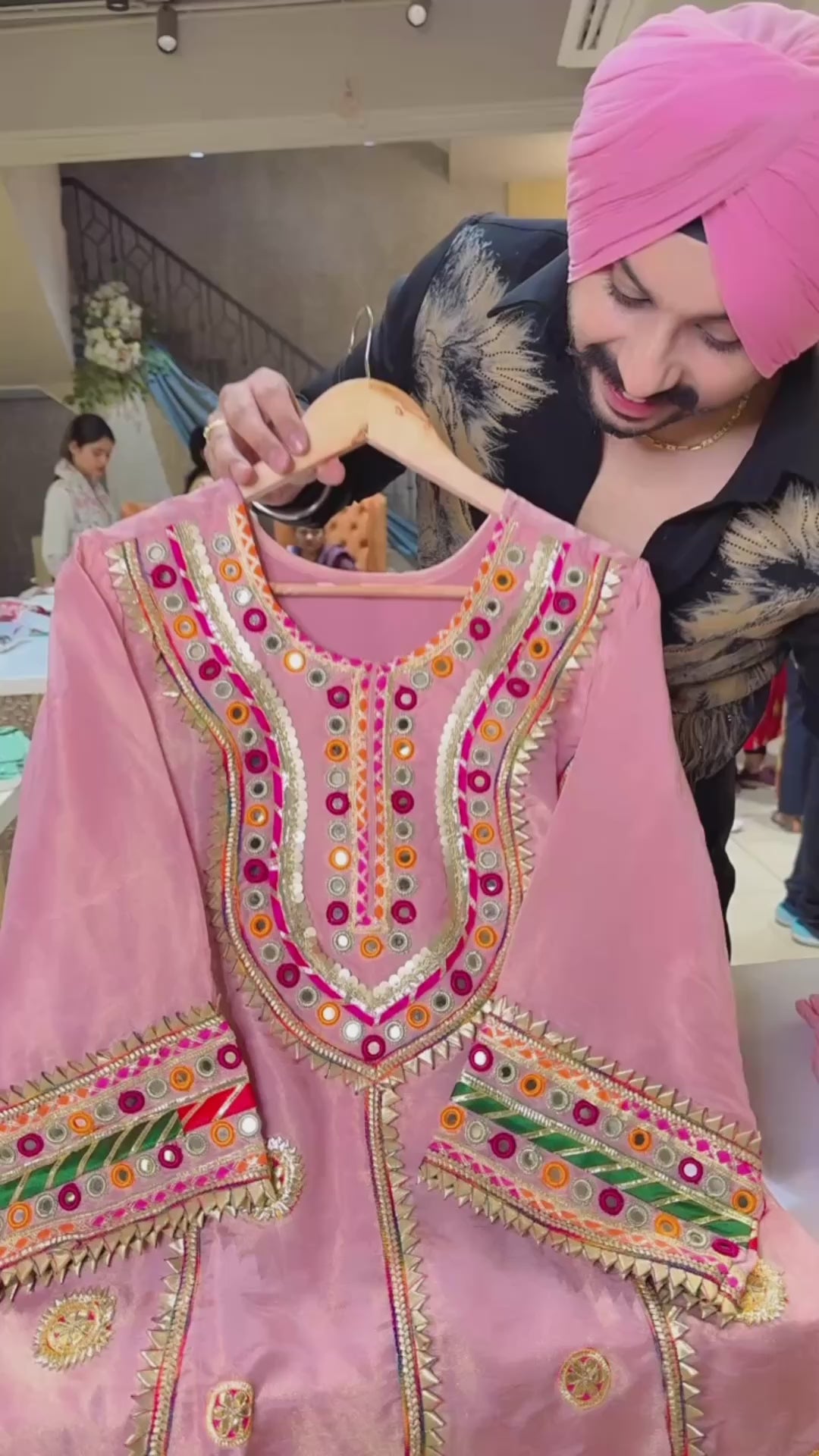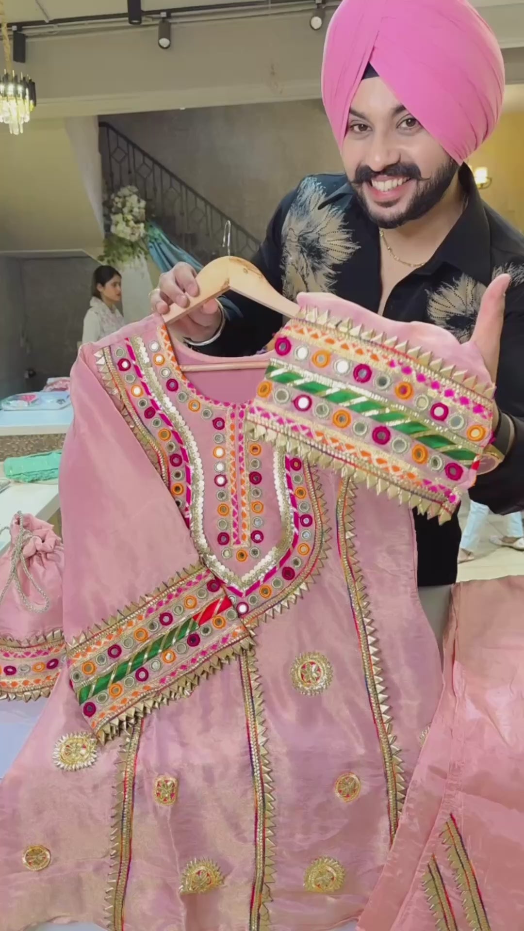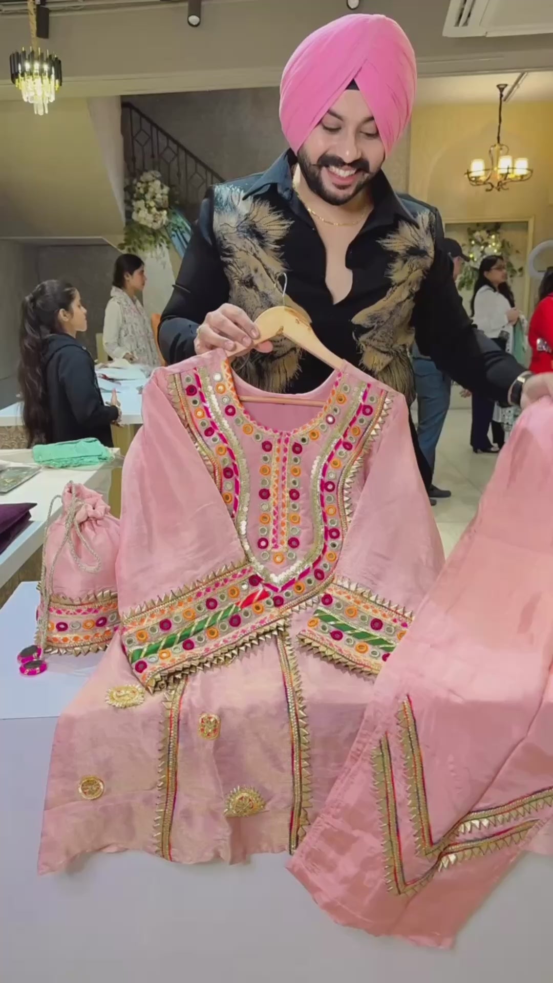 Light pink Shimmer Silk Tissue Hand embroidered & Gotta work Paplum bell Bottom Coord set with Cute Potli