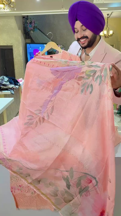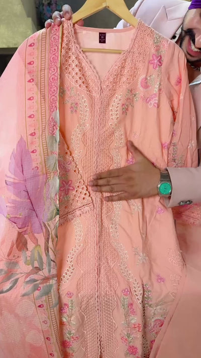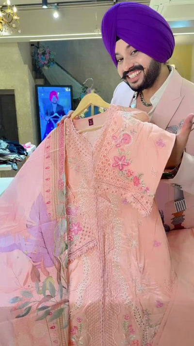 Peach Pure Cotton Embroidered & cut work Kashmiri Suit with Floral Print Kota Doria Duppata