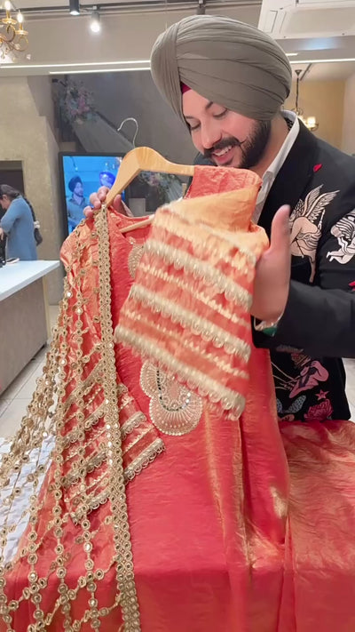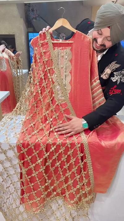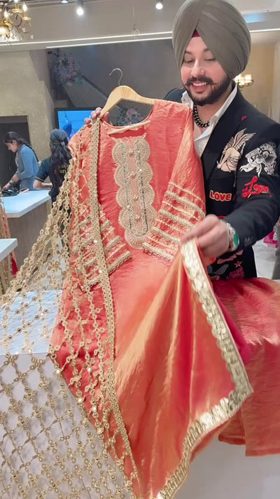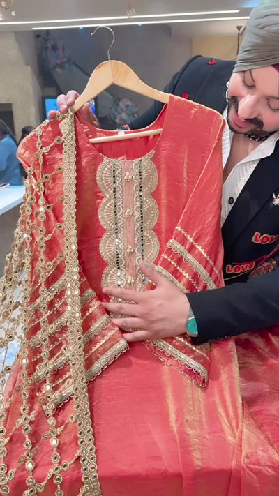Peachish Orange Crush Shimmer Tissue Pearl Work Long Straight Kashmiri Suit with Designer Lace Duppata