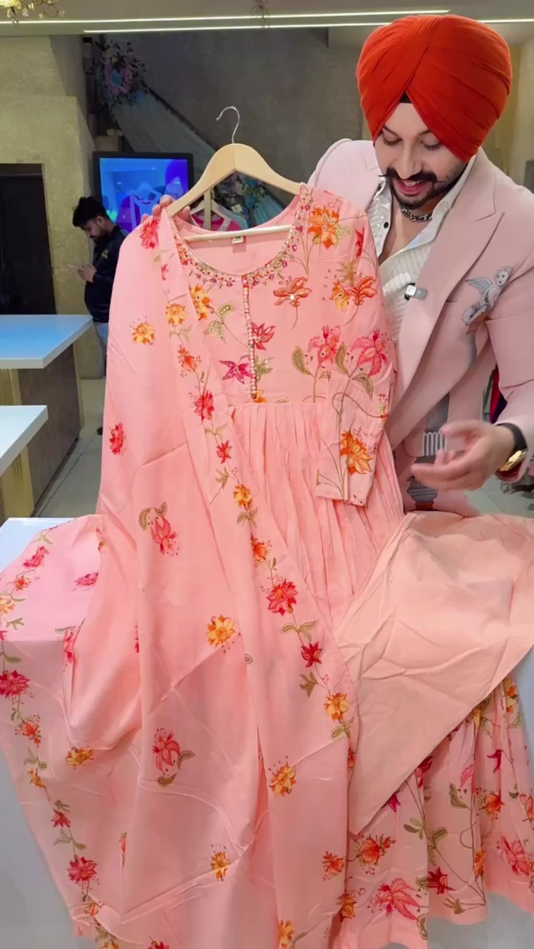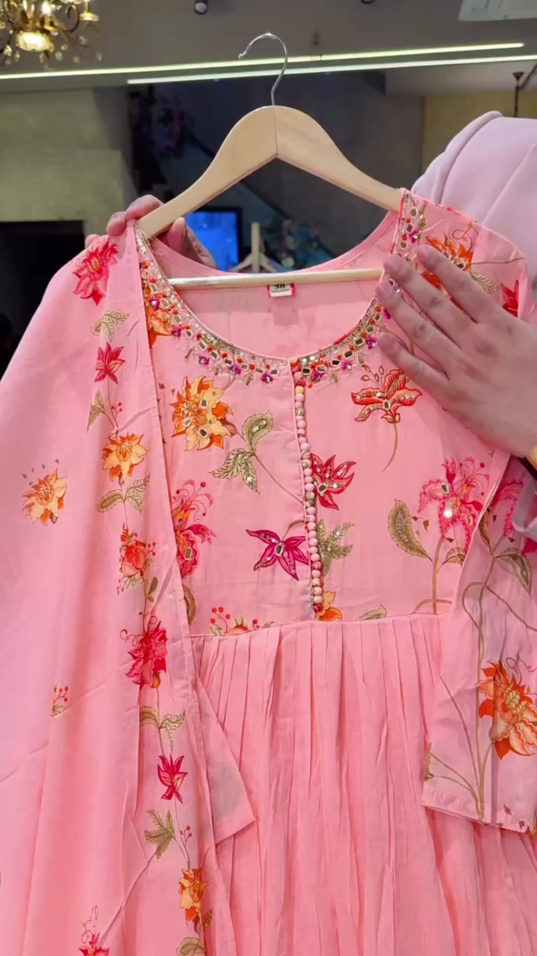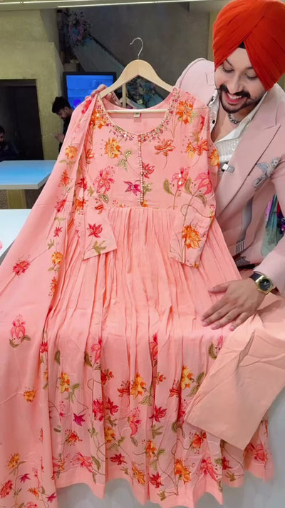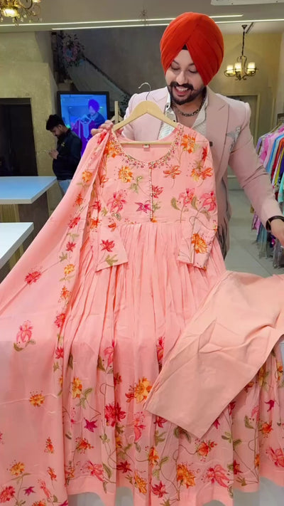 Peachish Pink Mal Cotton Floral Print Hand embroidered Anarkali Suit