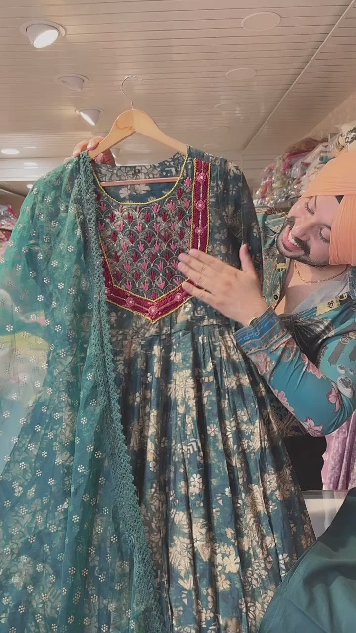 Peacock Muslin Silk Embroidered Anarkali suit with Beautiful Mukash work on organza Duppata