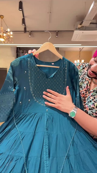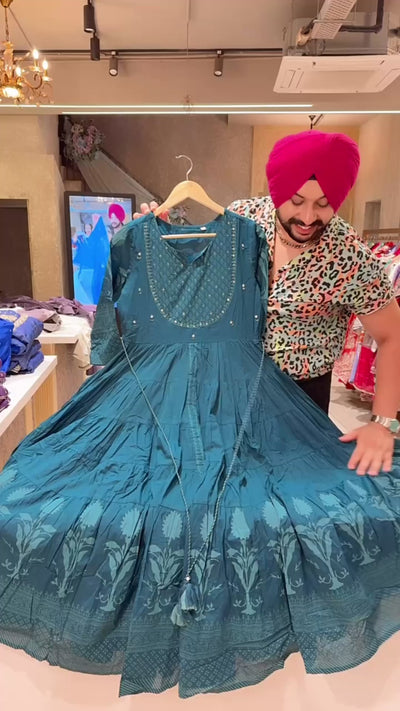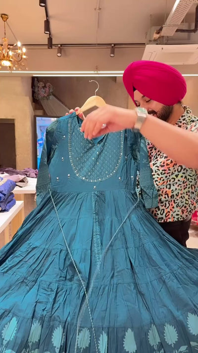 Peacock Colour Pure Cotton Full Flair Embroidered Neck Indowestern Anarkali Gown