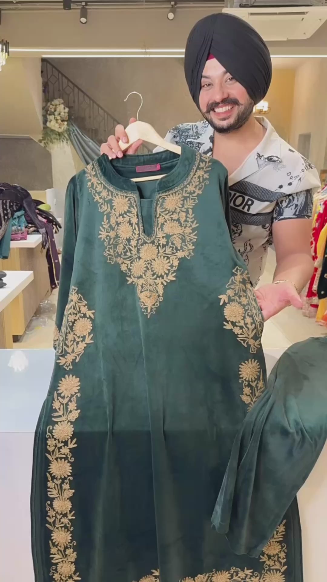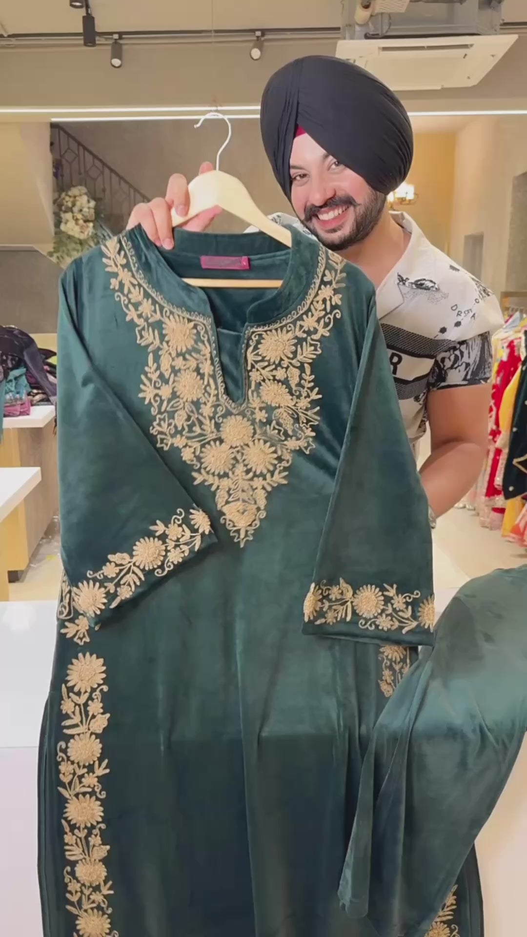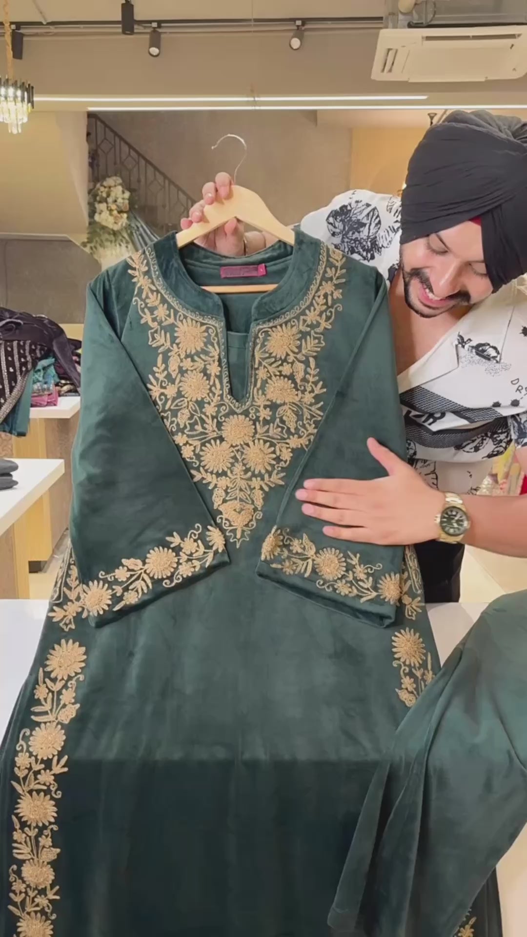 Peacock Green Heavy Strechable Velvet Embroidered Kashmiri Phiran Coord set