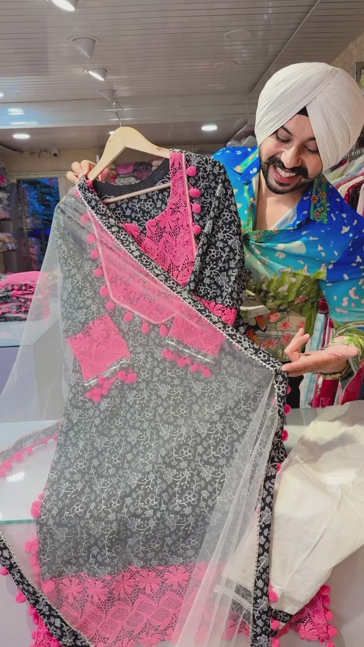 Pink black Pure Cotton Pom Pom suit with Pink Crochet Work on neck & Duppata