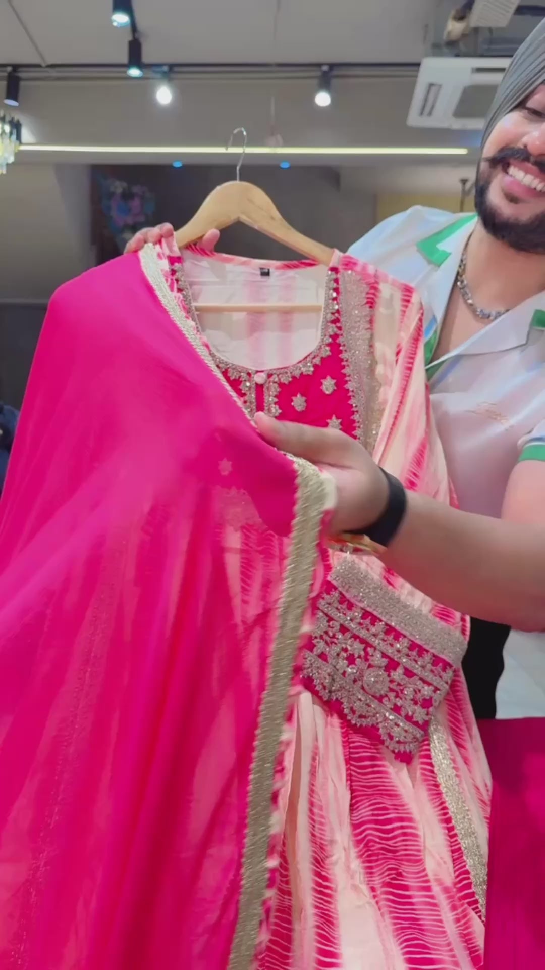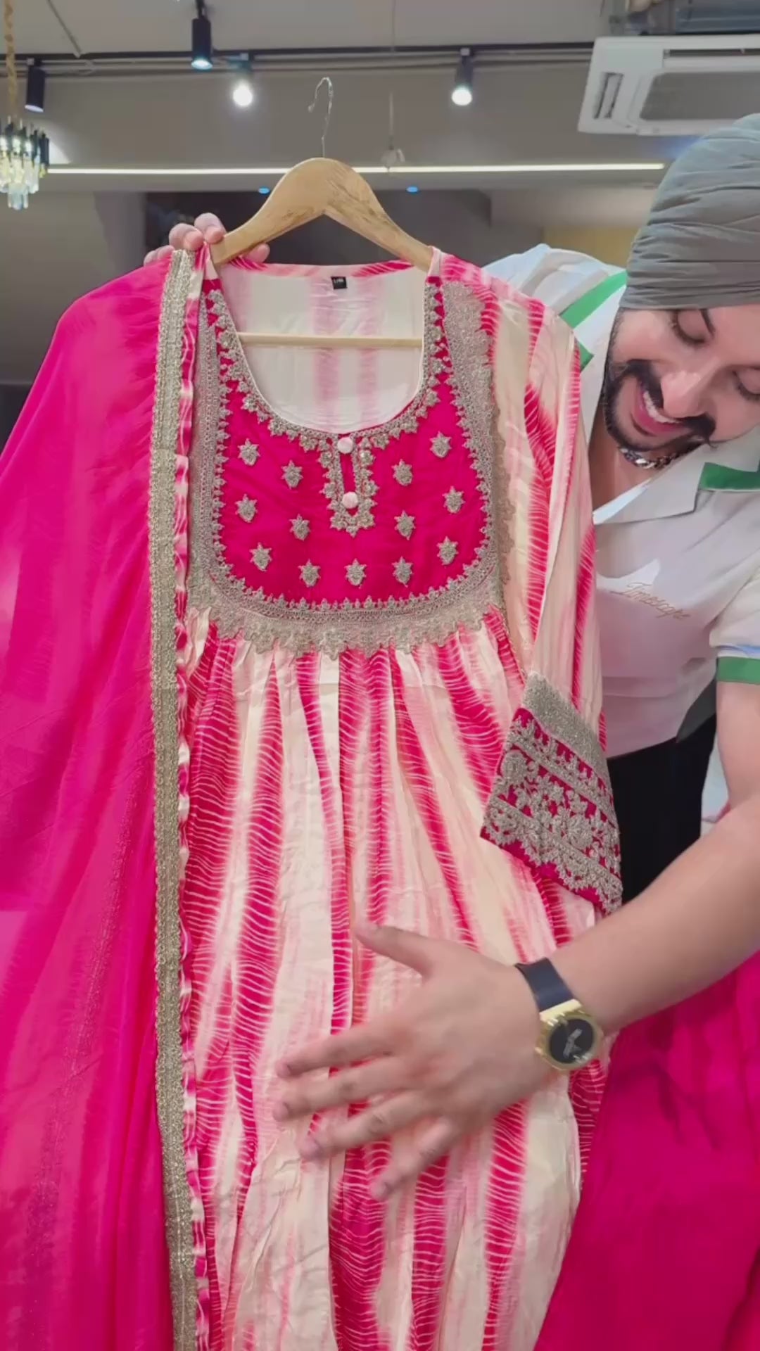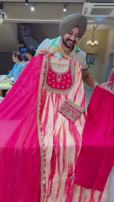Cream & Hot Pink Crepe Tie & Die Aline suit with Beautiful Chiffon Duppata