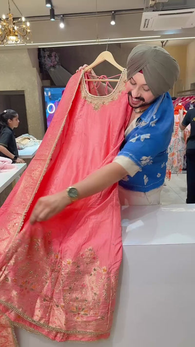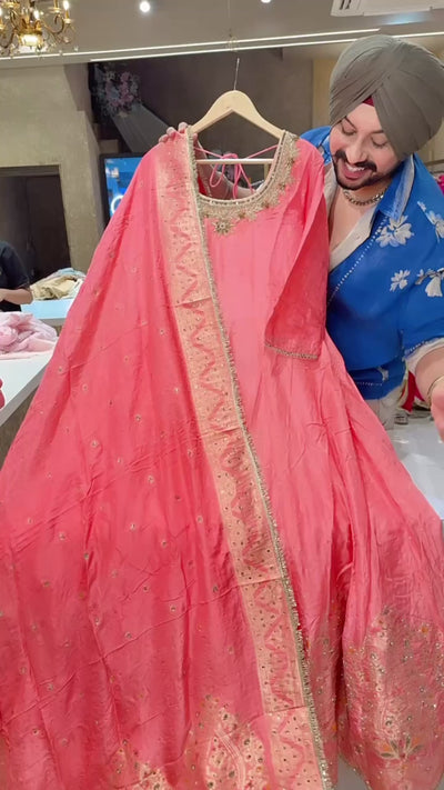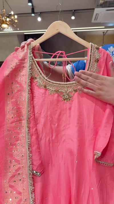 Gajri Pink Soft Silk Fill Flair Hand embroidered Anarkali Gown with Heavy Banarasi Border & Duppata