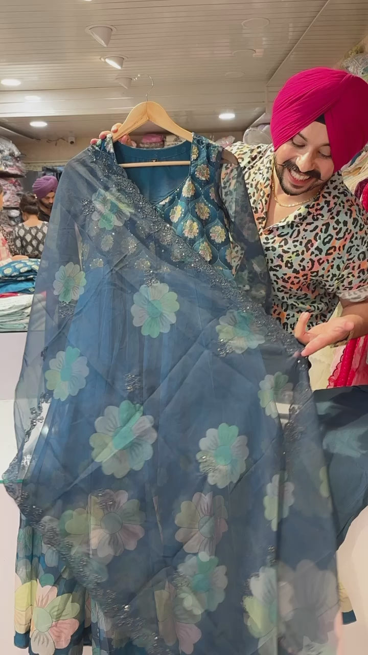 Teel blue organza Full Flair Anarkali suit with Beautiful sequence work on neck