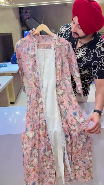 Pink & Off White Cotton Indowestern dress featuring Floral Print and a Stylish Shrug