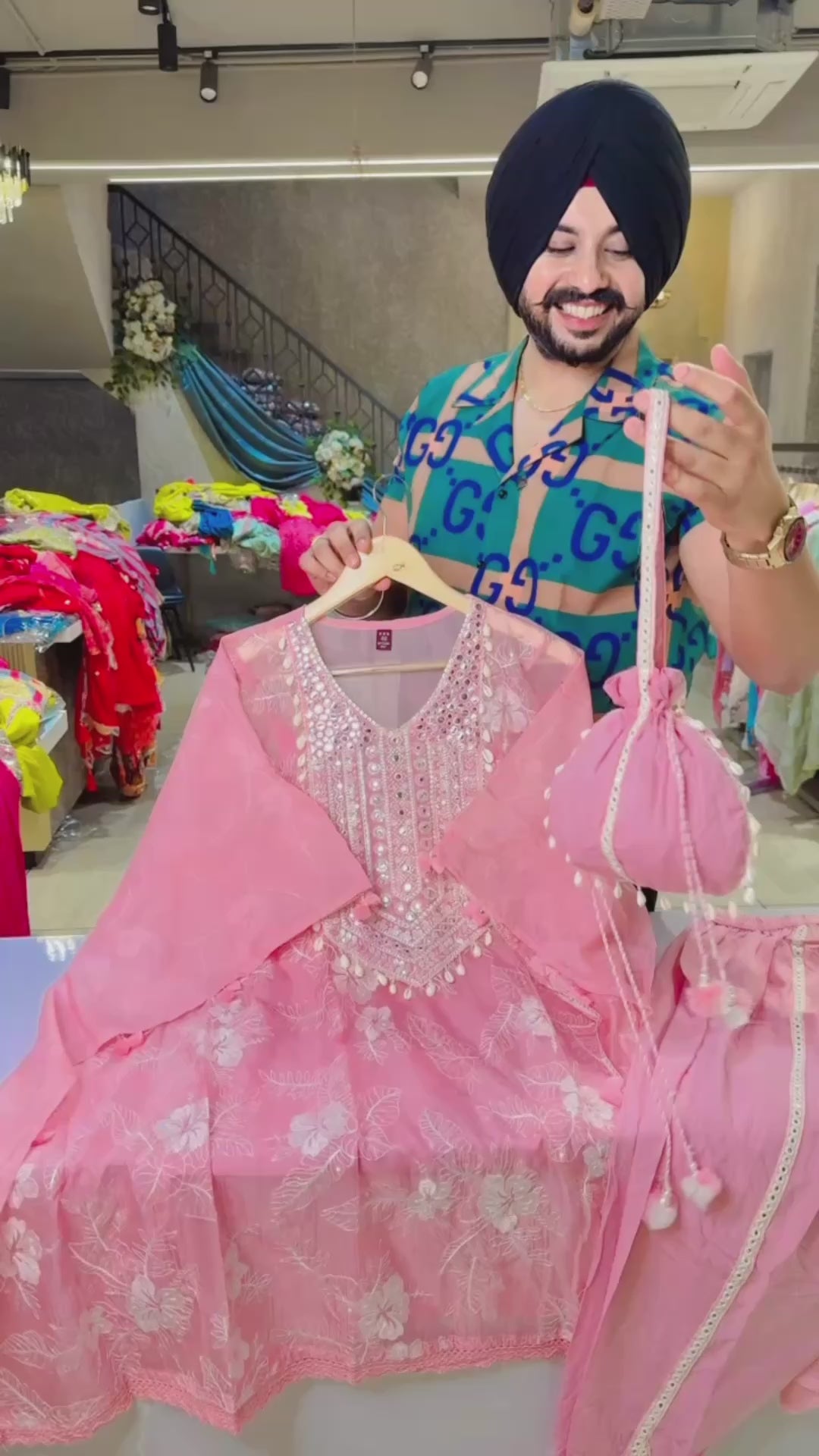 Pink Organza Fully embroidered Kaftan Coord set with Cute Potli & tulip pants