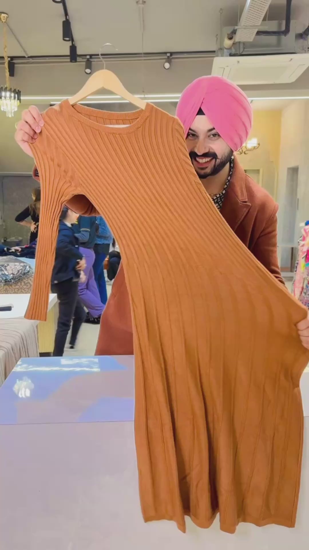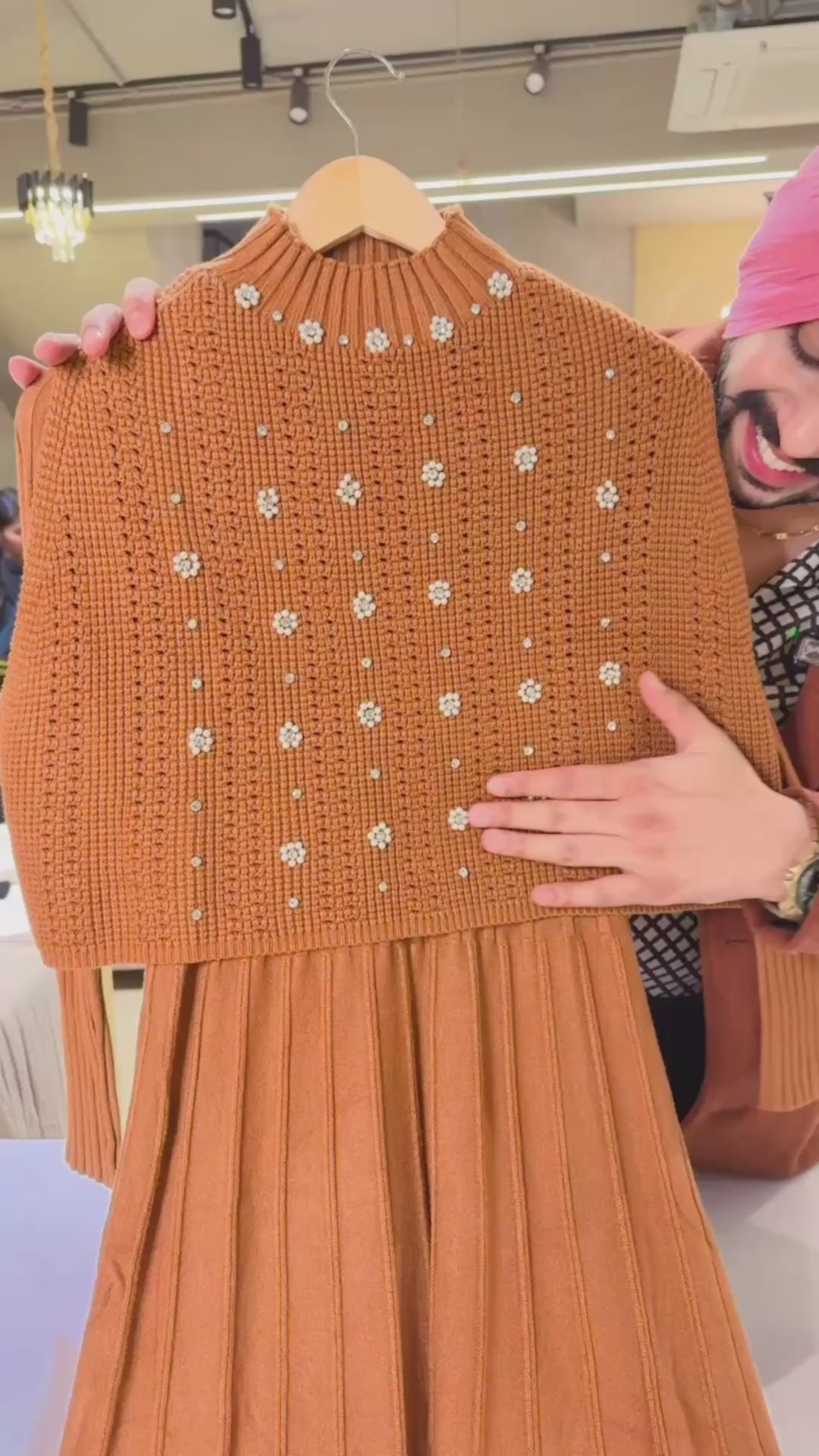 Tan brown Imported Woolen knee length Dress with Pearl work woolen Crop