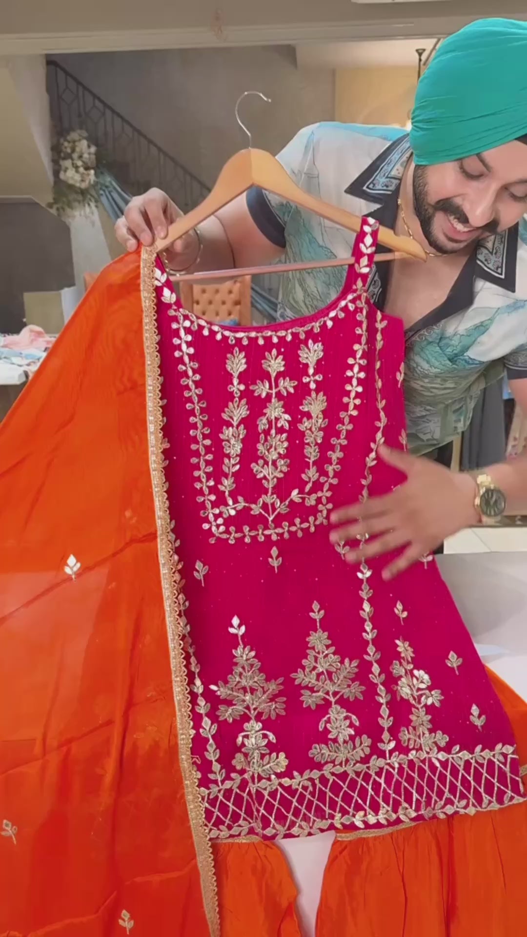 Rani pink & Orange Chinon Heavy Gotta Embroidered Straight Sleeves Gararra suit with Beautiful Dupatta