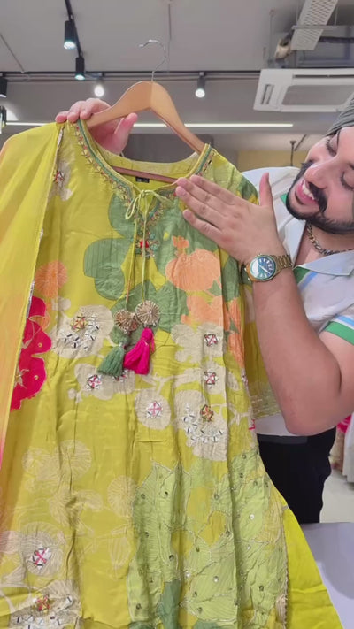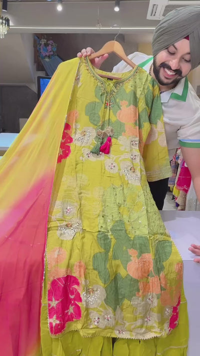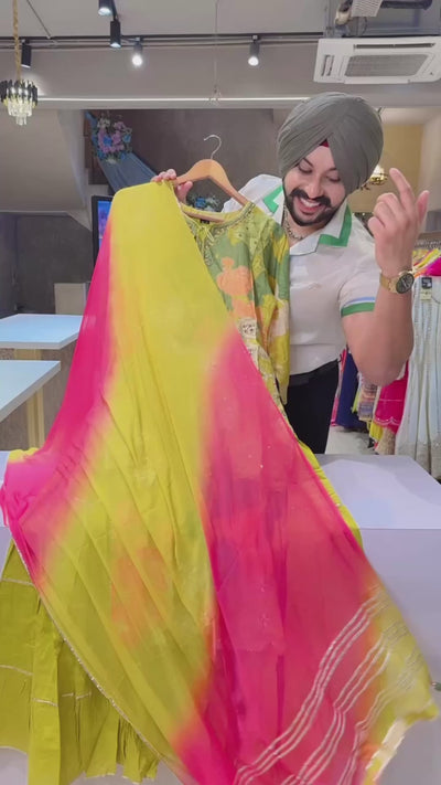 Lime Green Muslin silk Hand embroidered Attached Double layer Dress with beautiful Tie & Dye Duppata