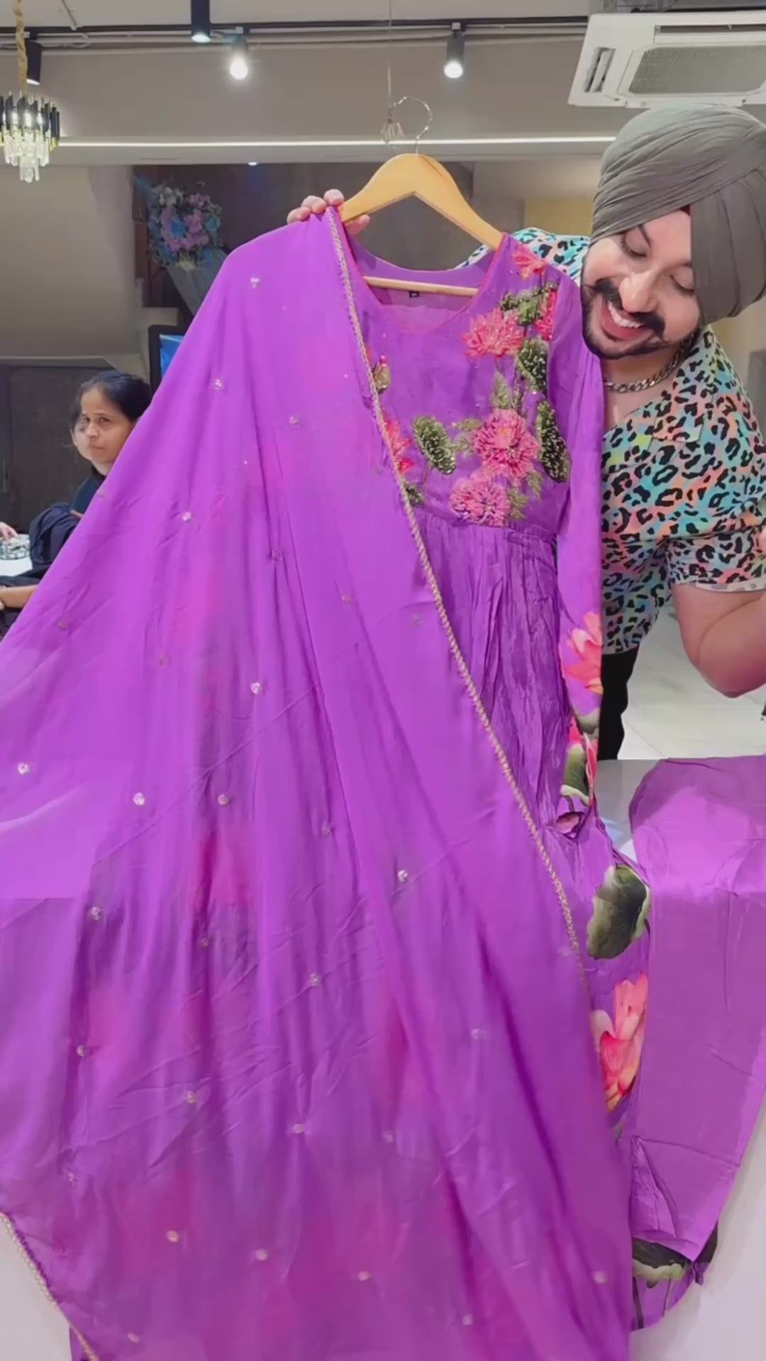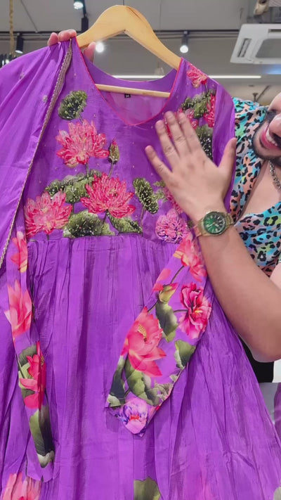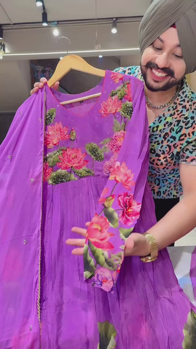 Purple Chinon Floral Print Full Flair Anarkali Suit with Beautiful Hand work on neck & Sequins work Duppata