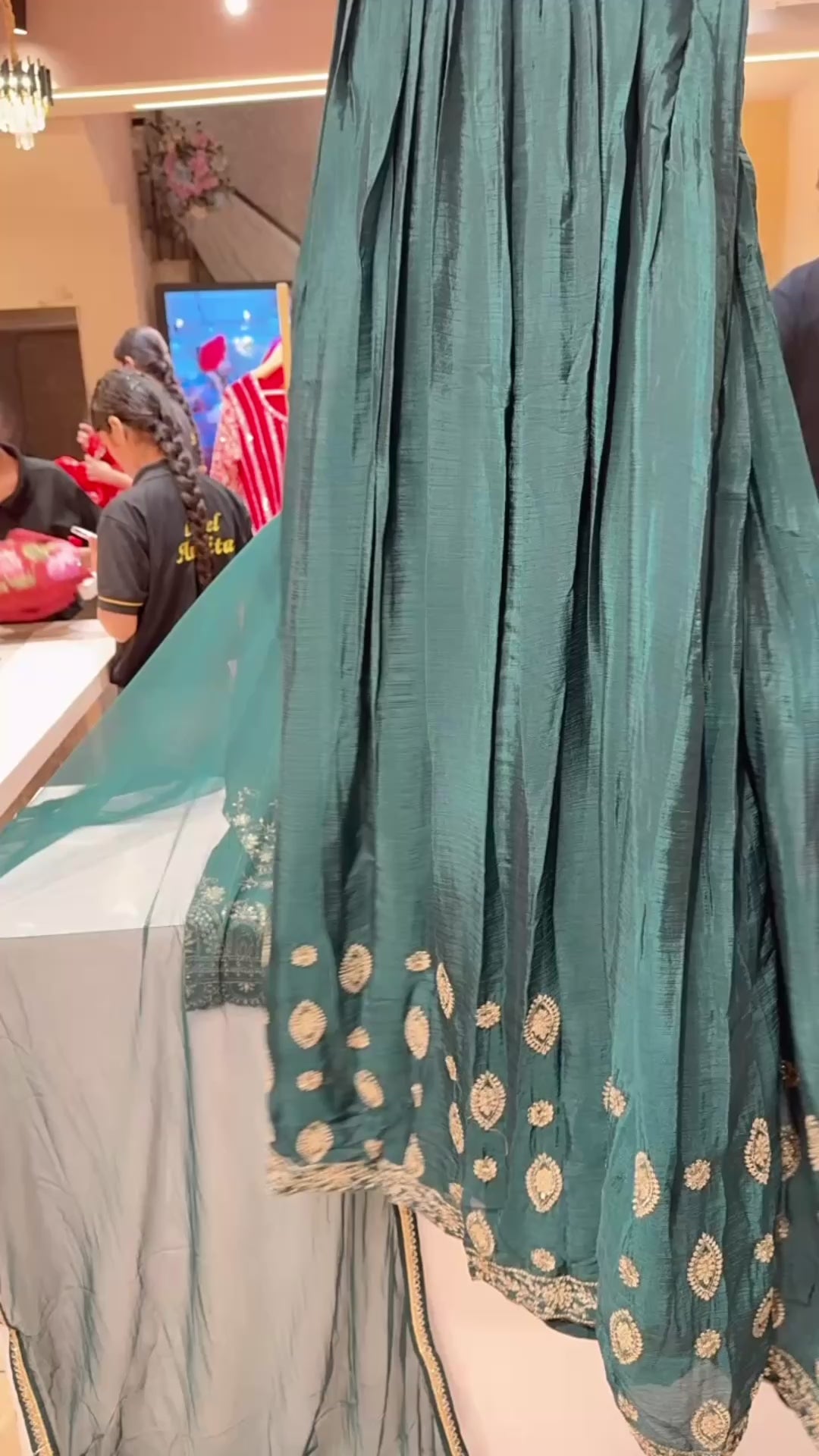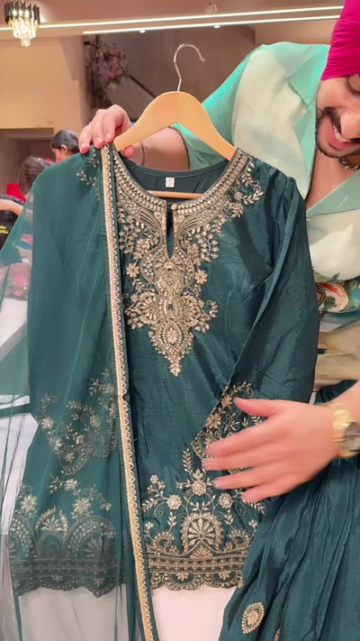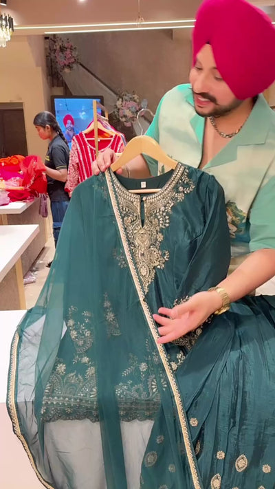 Peacock Green Chinon Heavy embroidered Full Flair Gattering Sharara Set with Net Duppata
