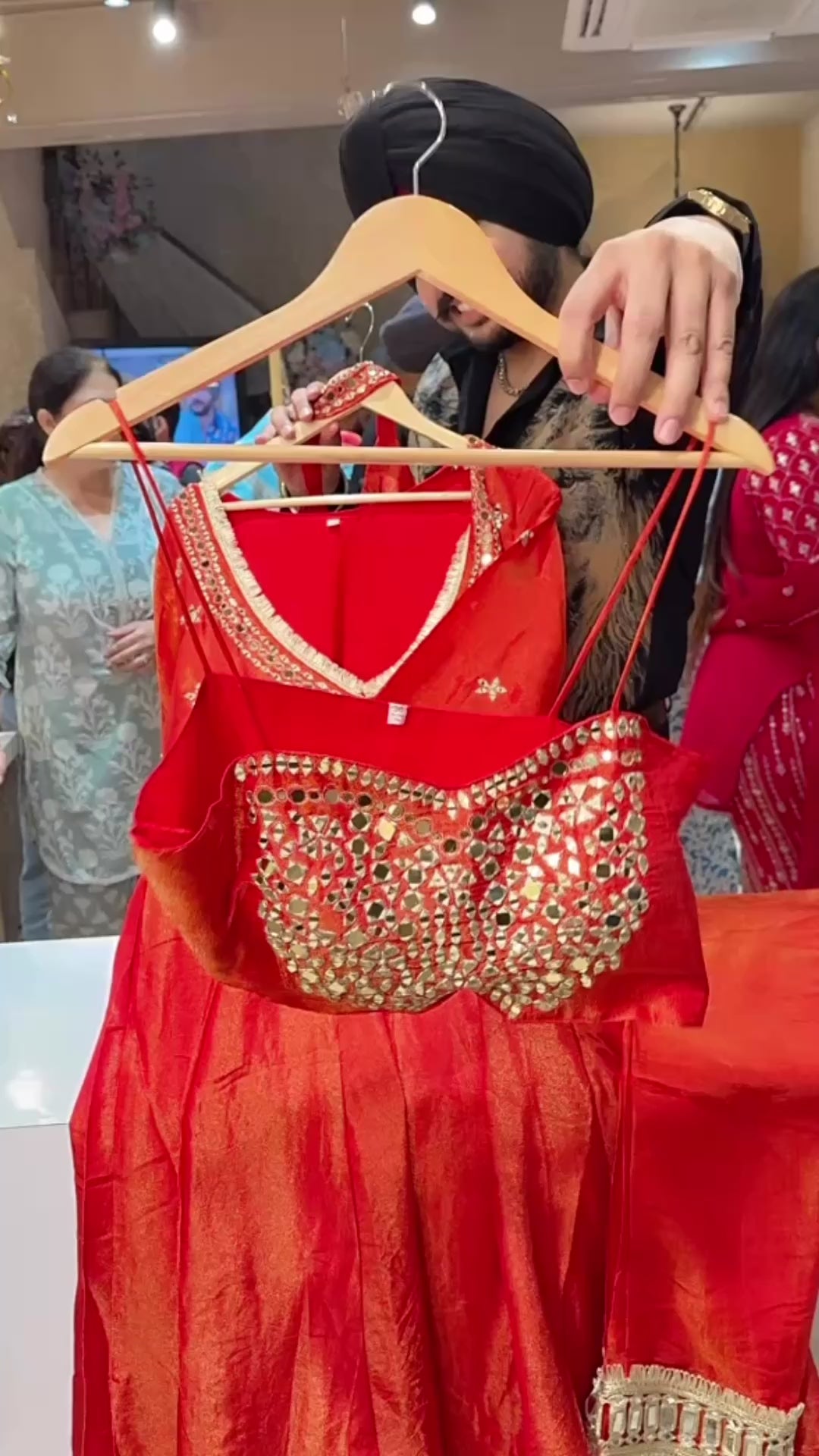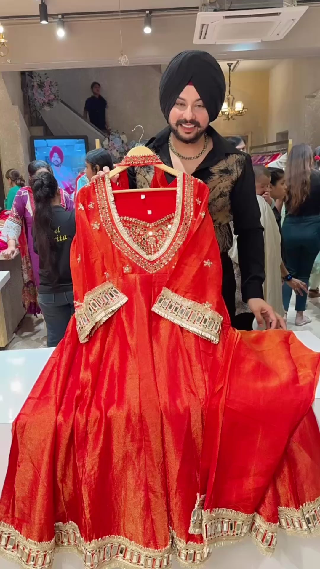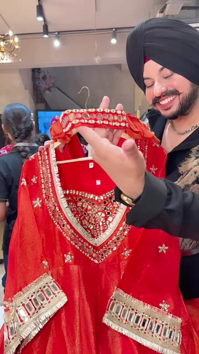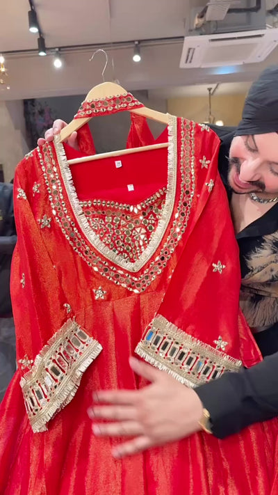 Reddish Orange Shimmer Slilk Mirror work Anarkali Suit with Heavy bustier & Necklace Duppata